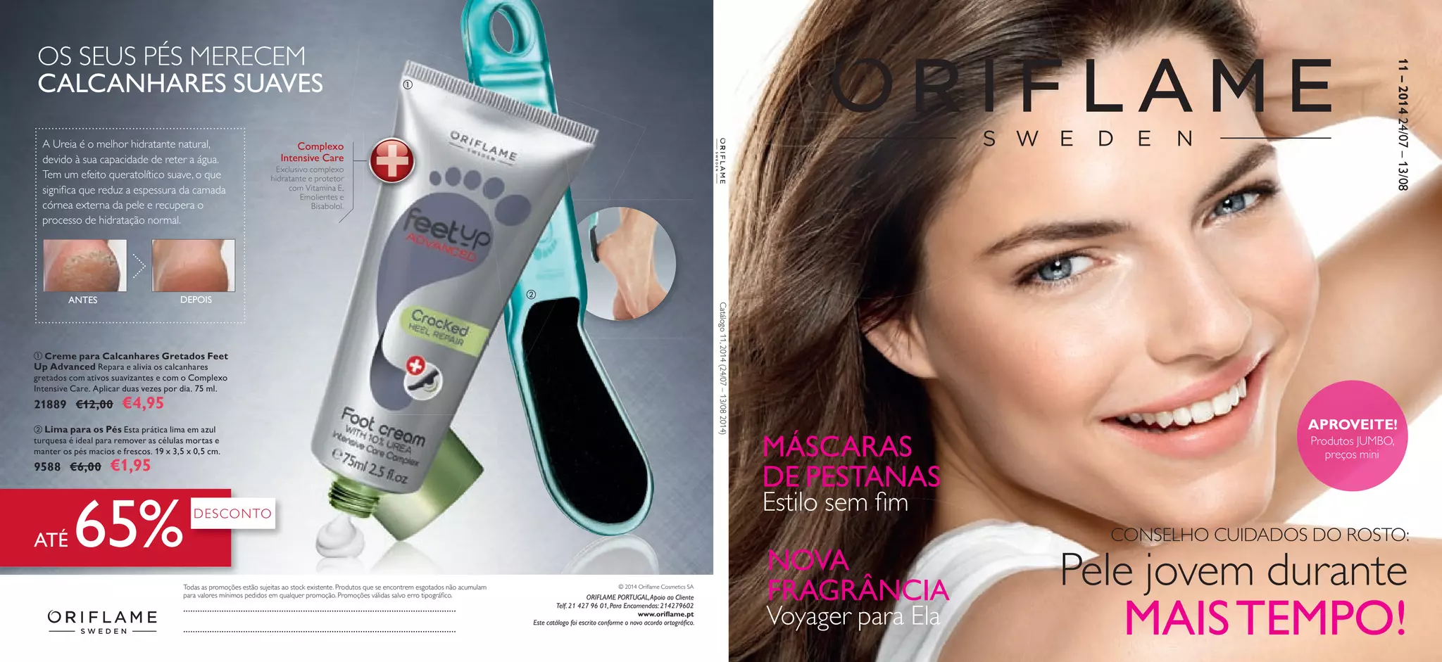 O documento fornece informações sobre produtos para cuidados dos pés, incluindo um creme para calcanhares gretados e uma lima para os pés. Também apresenta produtos de maquiagem como máscaras de pestanas e uma nova fragrância. O catálogo oferece descontos de até 65% em vários itens.