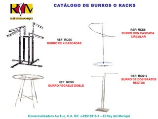 Este catálogo lista diferentes modelos de racks e prateleiras para exibição de produtos, incluindo racks plegáveis, racks com braços e ganchos, canastas metálicas com rodas e racks circulares para exposição. O documento também promove bolsas ecológicas e encoraja os clientes a cuidar do planeta.