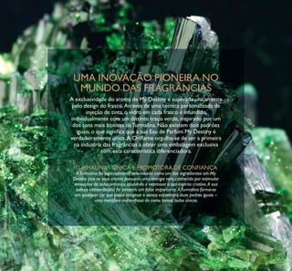 Este documento promove a nova fragrância feminina My Destiny da Oriflame, destacando suas características únicas. A fragrância tem notas de flor de lótus, peônia e patchouli, e cada frasco contém um padrão de cor única inspirada na turmalina. Além disso, o documento apresenta maquiagens e acessórios que complementam o tema da coleção.