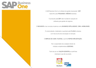 O SAP Business One é um ERP projetado para pequenas e médias empresas, oferecendo gestão integrada das operações de negócios, como finanças, vendas e CRM. Com funcionalidades como dashboards personalizados, mobilidade via dispositivos móveis e suporte a add-ons, o software permite uma gestão eficiente e flexível, adaptando-se às necessidades específicas de cada empresa. A Fluxus, atuando há mais de 20 anos, é a parceira autorizada para comercialização e suporte do SAP Business One no Brasil.