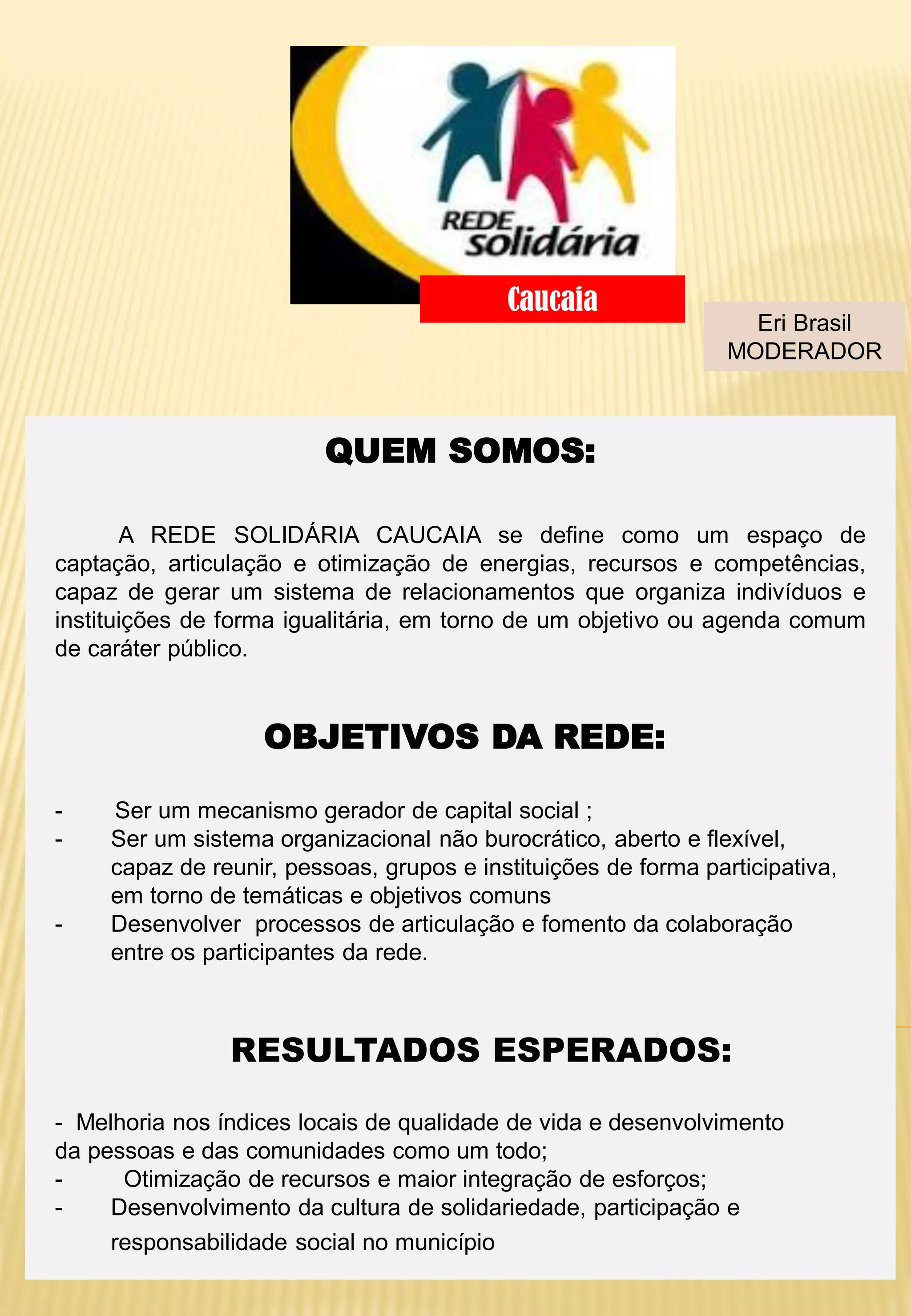 A Rede Solidária Caucaia se define como um espaço para captação e articulação de recursos e competências para gerar relacionamentos igualitários entre indivíduos e instituições em torno de objetivos públicos comuns. Seus objetivos são gerar capital social, reunir participantes de forma flexível em torno de temáticas compartilhadas, e fomentar colaboração. Seus resultados esperados incluem melhorar a qualidade de vida local, otimizar recursos e esforços, e desenvolver uma cultura de solidariedade e responsabilidade social.