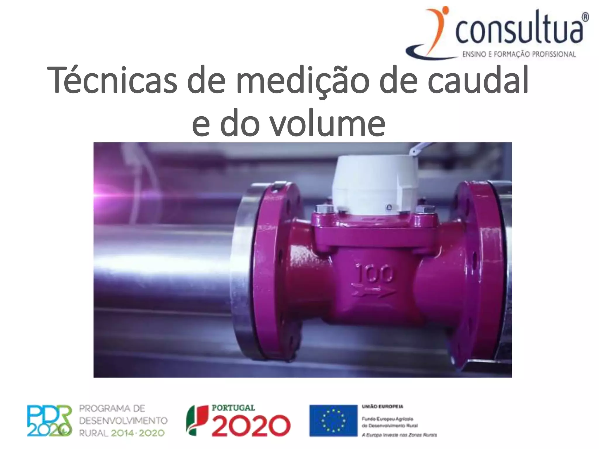 Este documento descreve técnicas e métodos para medir o caudal e volume de água, incluindo métodos volumétricos, da área-velocidade e da seção de controle. Também discute tipos de medidores de água instantâneos e totalizadores, como medidores de hélice, turbina, Dethridge e ultrassônicos. Finalmente, aborda questões a considerar na seleção e manutenção de medidores de água.