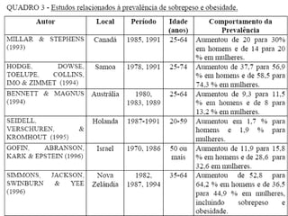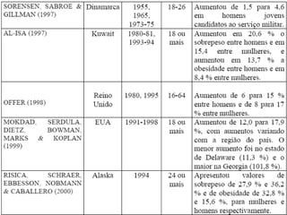O documento resume as principais causas da obesidade, incluindo fatores genéticos, ambientais, comportamentais e fisiológicos. Também discute a epidemiologia da obesidade e suas implicações para a saúde, como o aumento da mortalidade associada ao ganho de peso e comorbidades como doenças cardíacas e diabetes.