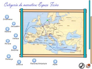 Este documento descreve a jornada de um Cavaleiro através de várias cidades europeias, começando na Dinamarca e passando por Jerusalém, Ravena, Veneza, Ferrara, Bolonha, Florença, Gênova e Flandres, explorando suas características como homem de fé, bondoso, corajoso e curioso.