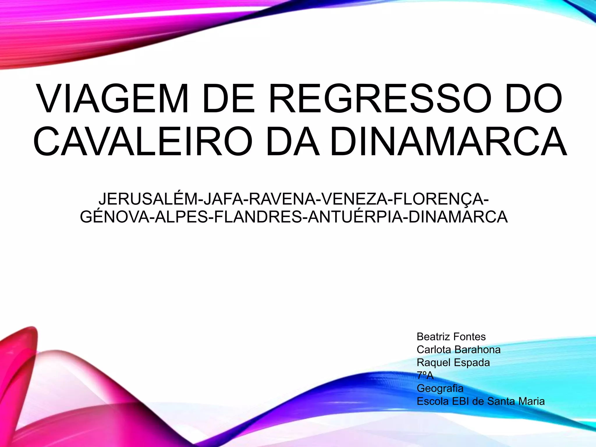 Este documento resume a viagem de regresso do Cavaleiro da Dinamarca de Jerusalém até à Dinamarca, passando por cidades como Jafa, Ravena, Veneza, Florença, Génova, os Alpes, Flandres, Antuérpia. Fornece informações sobre o clima, relevo, população e distâncias entre cada uma das cidades por onde passou nesta longa viagem.
