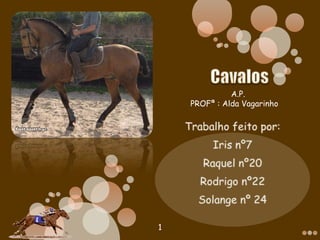O documento discute a história e características dos cavalos. Começa com a origem evolutiva dos cavalos há 60 milhões de anos e descreve como os cavalos foram usados na antiguidade. Em seguida, apresenta várias raças de cavalos populares e suas características, incluindo Andaluz, Puro Sangue Lusitano, Puro Sangue Inglês e Árabe. Conclui discutindo os cuidados com os cavalos.