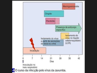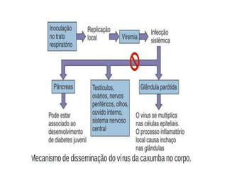 O documento descreve a parotidite causada pelo vírus da caxumba. O vírus é endêmico no inverno e primavera e causa principalmente inflamação das glândulas parótidas. A replicação viral ocorre no citoplasma das células após ligação às proteínas de superfície, e o vírus se dissemina pela viremia, podendo acometer outros órgãos."
