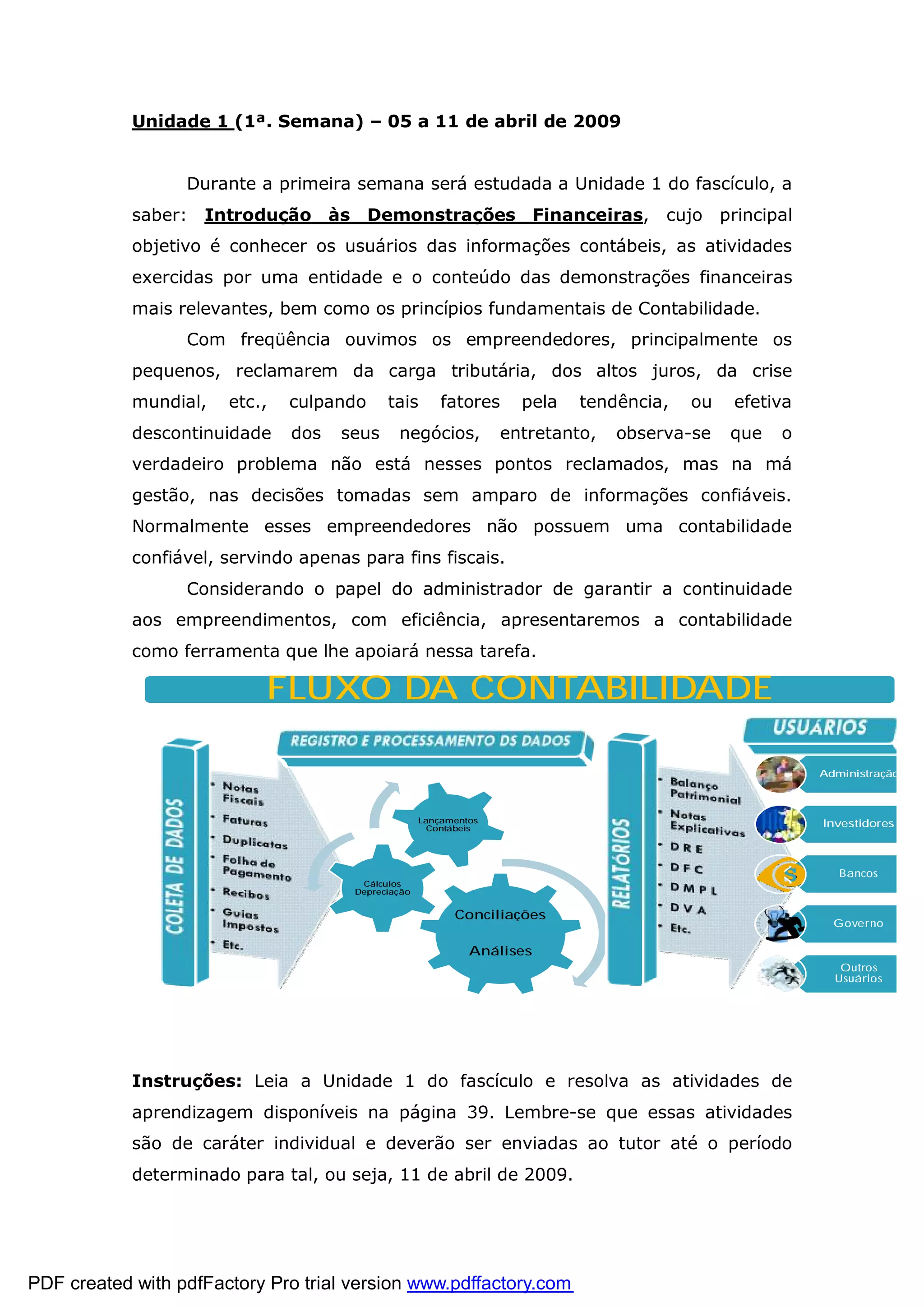 A primeira semana irá estudar a introdução às demonstrações financeiras, incluindo os usuários das informações contábeis e o conteúdo das principais demonstrações. Muitos empreendedores culpam fatores externos pelo fracasso dos seus negócios, mas na verdade o problema é a má gestão e decisões tomadas sem informações confiáveis. A contabilidade é uma ferramenta que pode apoiar os administradores a garantir a continuidade dos empreendimentos de forma eficiente.