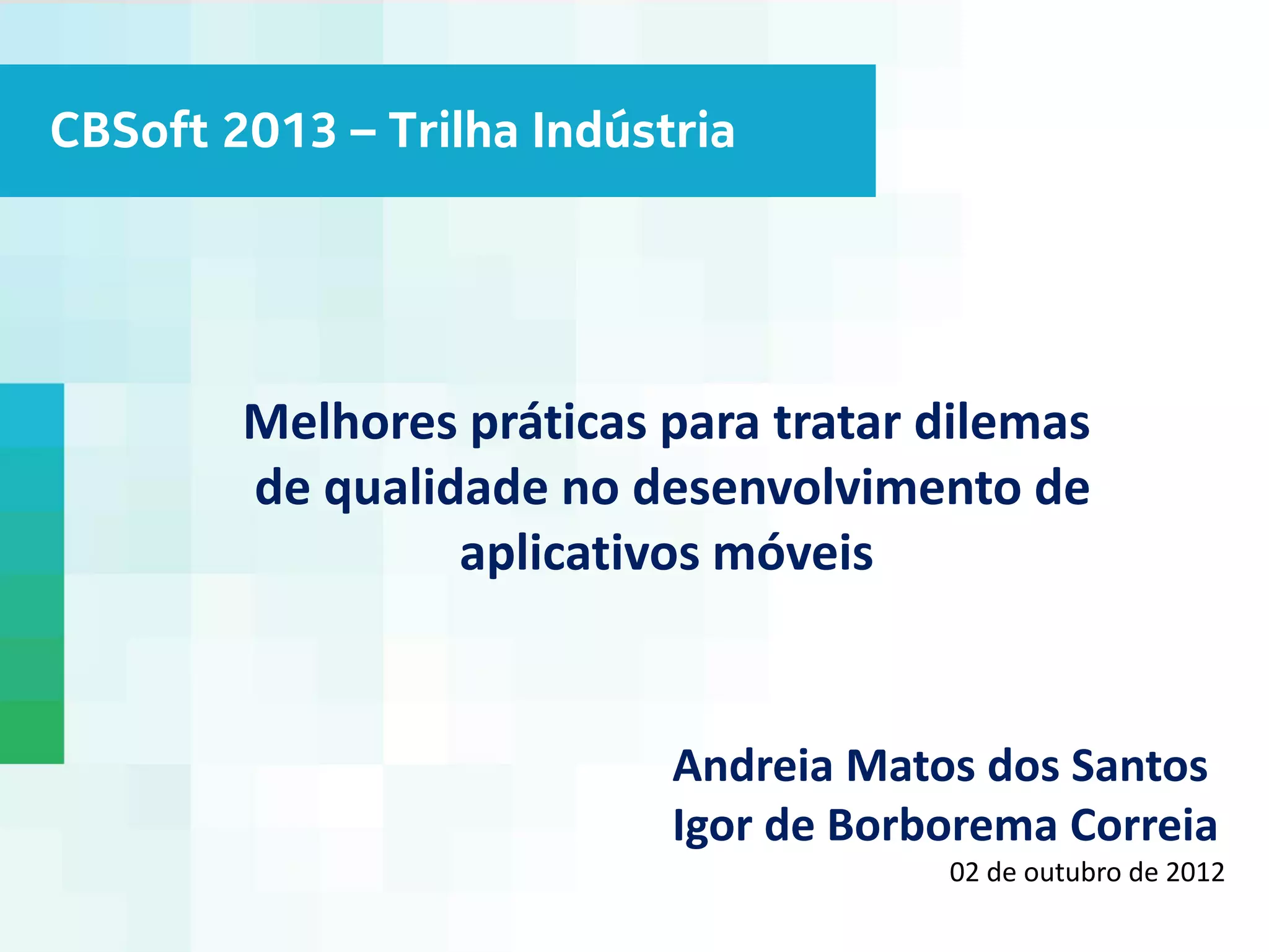 O documento discute as melhores práticas para tratar dilemas de qualidade no desenvolvimento de aplicativos móveis. Ele aborda a importância do teste de aplicativos móveis, os principais problemas de qualidade, como conectividade, usabilidade e segurança, e recomenda envolver os testes desde o início do projeto e seguir guias de qualidade de aplicativos.