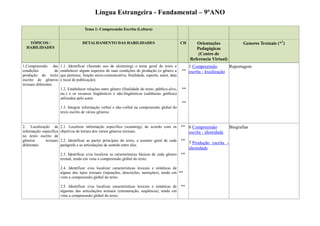 O documento fornece um quadro com tópicos e habilidades relacionadas ao ensino de Inglês como língua estrangeira no 9o ano do ensino fundamental, com links para orientações pedagógicas no Centro de Referência Virtual. O quadro abrange compreensão escrita, produção escrita, compreensão oral, produção oral e conhecimento léxico-sistêmico, com detalhamento das habilidades em cada tema.