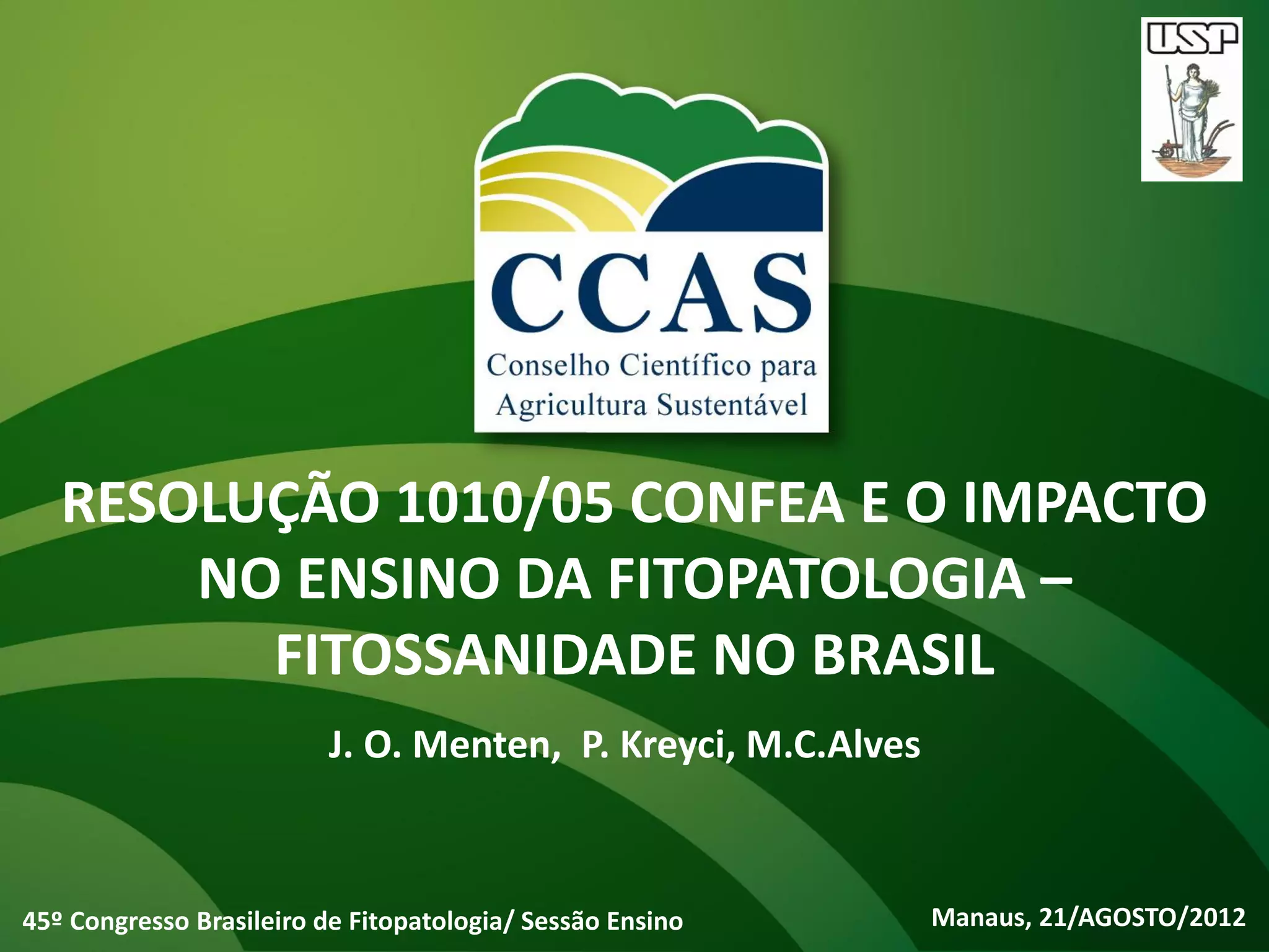 Este documento discute o impacto da Resolução 1010/05 do Conselho Federal de Engenharia e Agronomia (CONFEA) no ensino da Fitopatologia e Fitossanidade no Brasil. Apresenta as áreas de conhecimento e conteúdos exigidos pela resolução e propõe aprimoramentos no aplicativo da resolução para essas áreas.