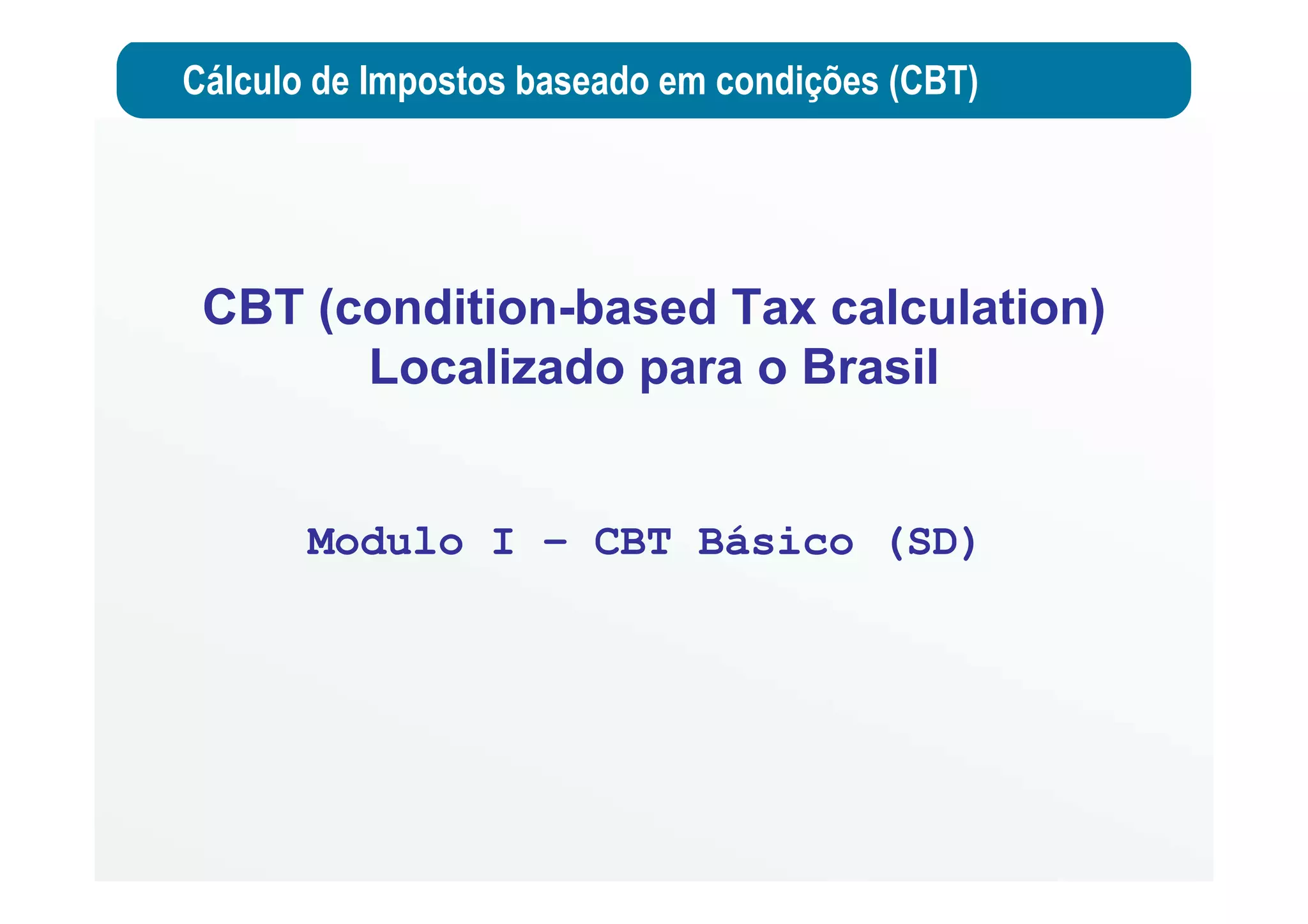 O documento descreve o Cálculo de Impostos baseado em condições (CBT) no Brasil, comparando-o com o método clássico. O CBT armazena as taxas de impostos diretamente nas tabelas brasileiras e gera registros de condição automaticamente, proporcionando maior flexibilidade em relação às necessidades dos clientes.