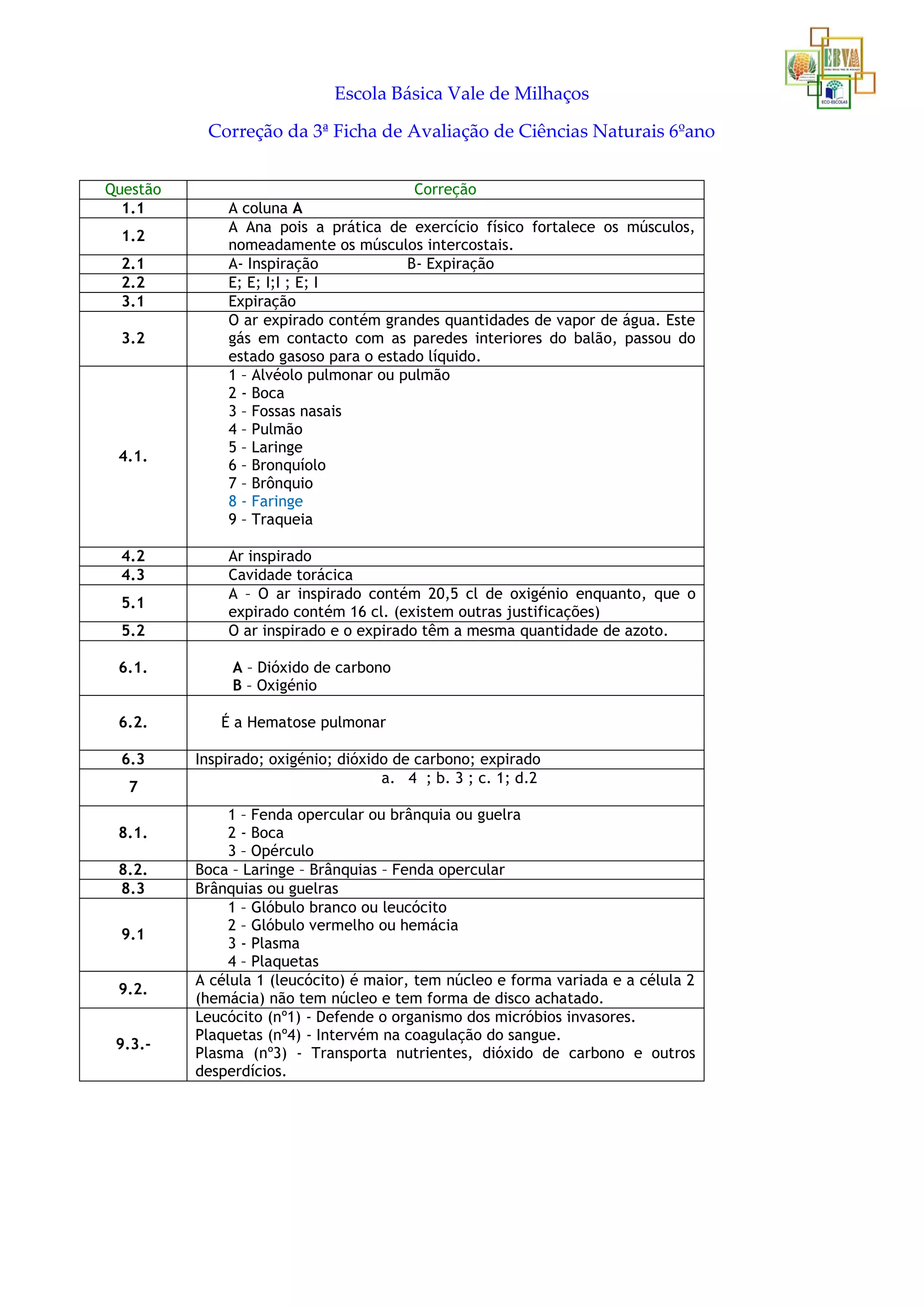 O documento apresenta a correção de uma ficha de avaliação de Ciências Naturais do 6o ano sobre os sistemas respiratório e circulatório. A correção aborda questões sobre a inspiração e expiração, os órgãos do aparelho respiratório humano e suas funções, as trocas gasosas pulmonares e as características e funções dos elementos figurados do sangue.