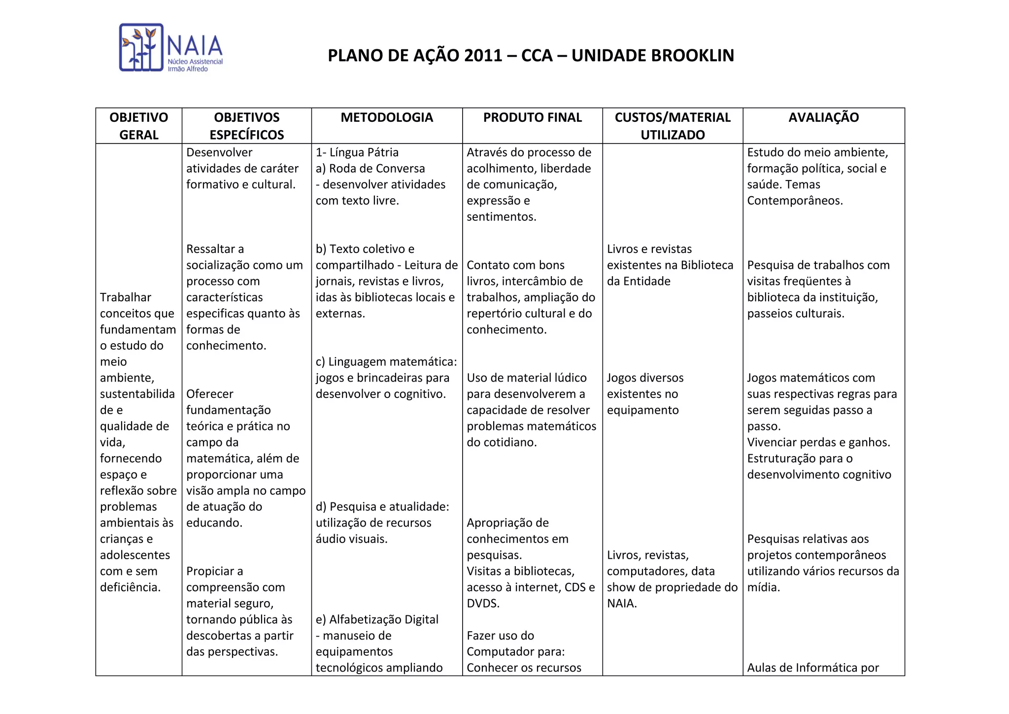 O plano de ação da unidade Brooklin tem como objetivo geral desenvolver atividades formativas e culturais. Os objetivos específicos incluem: desenvolver a língua pátria, matemática, pesquisa e atualidade, língua estrangeira, esporte, expressão artística e música. As atividades serão realizadas por meio de leitura, jogos, pesquisas e visitas culturais, com avaliação dos conhecimentos adquiridos.