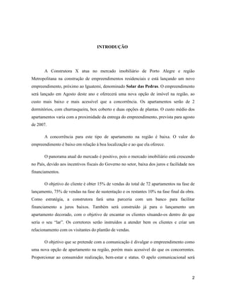O documento apresenta o planejamento de mídia para o lançamento de um novo empreendimento imobiliário denominado Solar das Pedras pela construtora X. O planejamento define os períodos da campanha, público-alvo, objetivos de mídia, estratégia e tática de veiculação nos meios de comunicação, alocando o orçamento disponível de R$180.000,00.