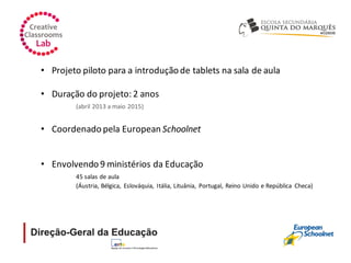 O documento descreve um projeto piloto que envolveu o uso de tablets em salas de aula portuguesas, incluindo objetivos como tornar os alunos mais independentes no processo de aprendizagem e promover diferentes cenários pedagógicos com o uso de tablets. O projeto durou dois anos e envolveu alunos do ensino secundário em cinco escolas portuguesas.