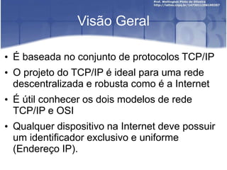 O documento discute os conceitos fundamentais de redes TCP/IP, incluindo os protocolos da camada de transporte (TCP e UDP), endereçamento IP, classes de endereços IP e sub-redes. Ele fornece uma visão geral do modelo TCP/IP em comparação com o modelo OSI e descreve os principais protocolos em cada camada do modelo TCP/IP.