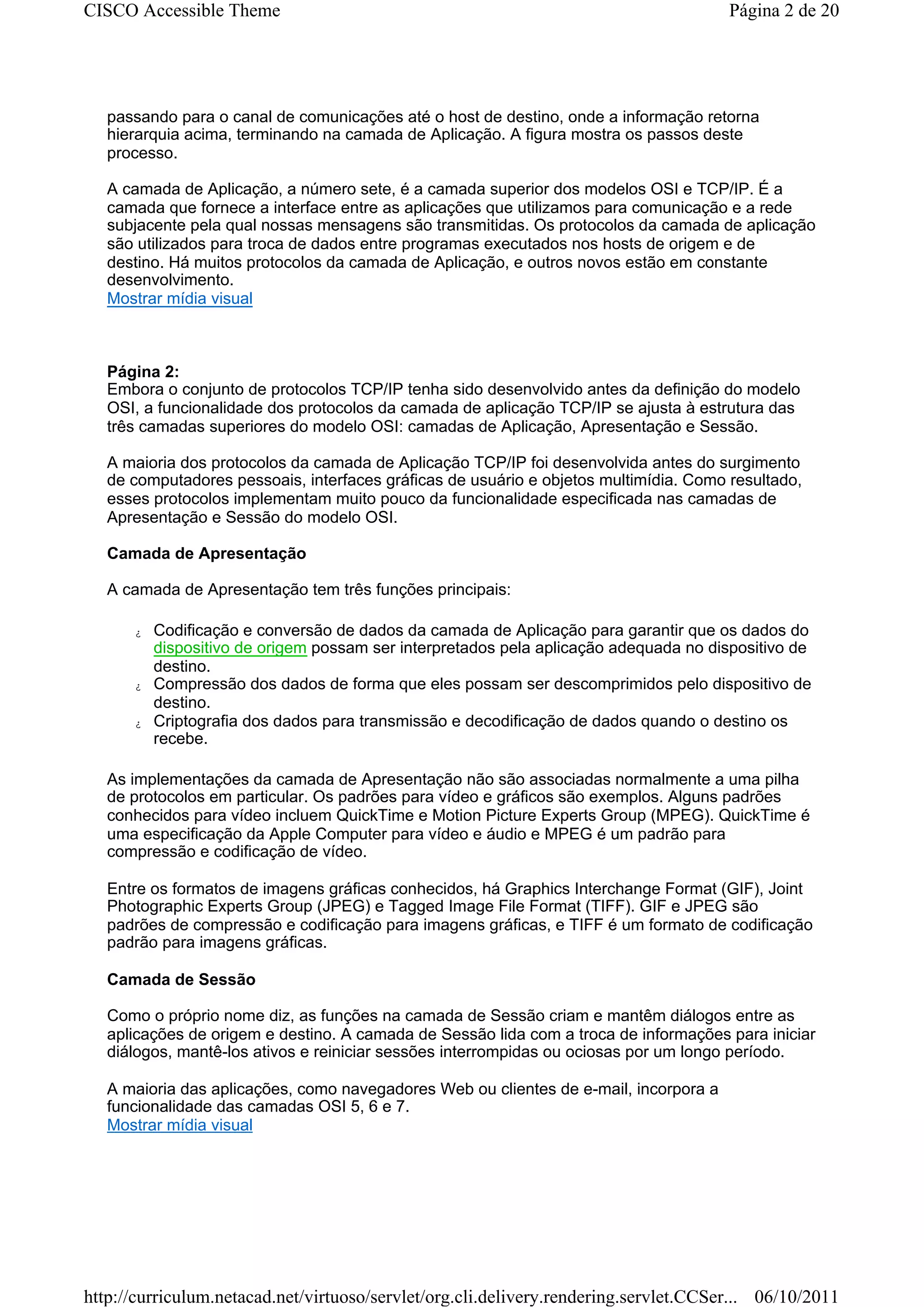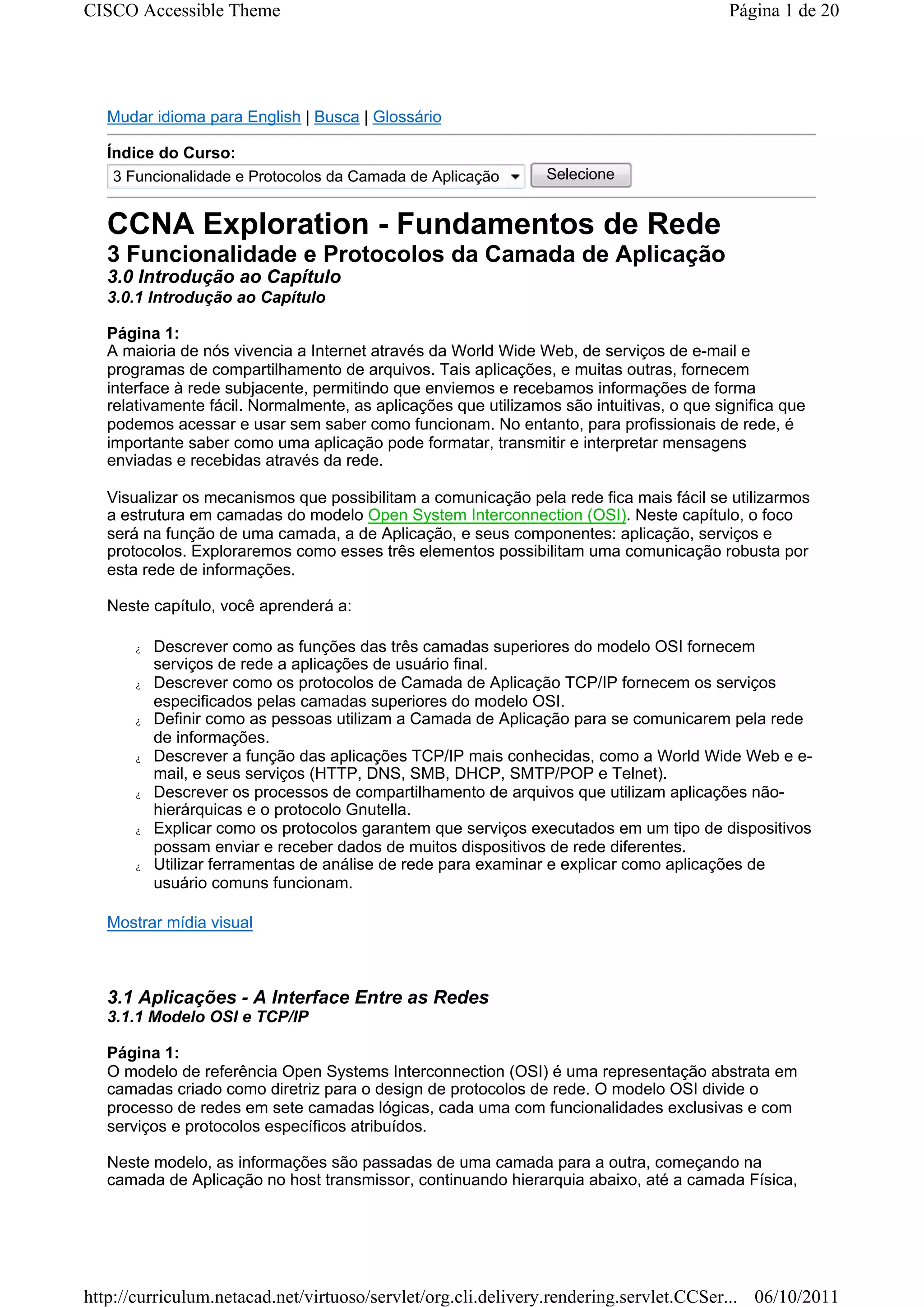 O documento descreve a camada de aplicação do modelo OSI e como ela fornece a interface entre aplicações de usuário e a rede subjacente. Ele explica como aplicações, serviços e protocolos interagem nesta camada para permitir a comunicação entre hosts. Além disso, discute alguns protocolos comuns da camada de aplicação, como HTTP, SMTP e DNS, e como eles fornecem serviços de rede.