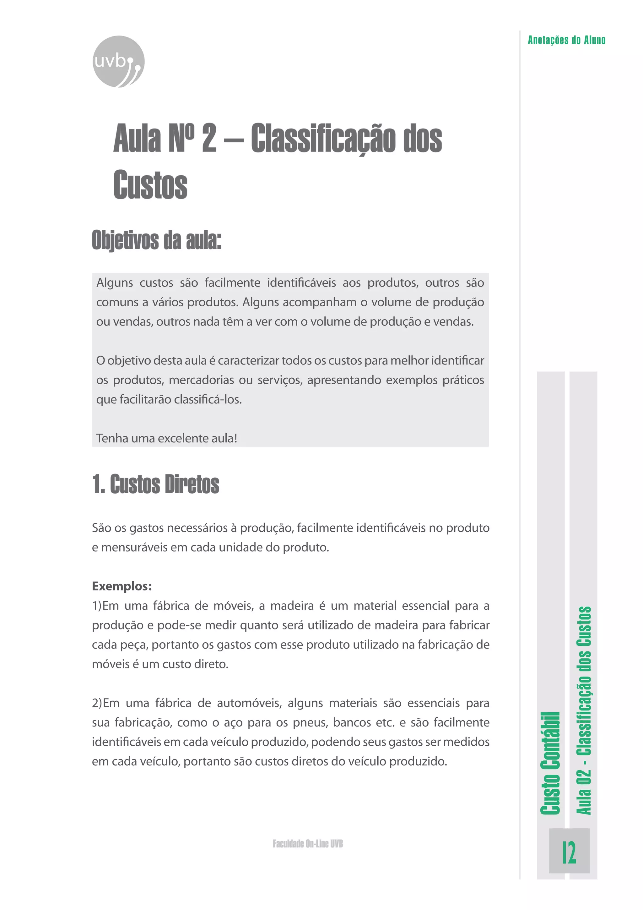 O documento discute a classificação de custos em diretos, indiretos, variáveis e fixos. Apresenta exemplos de cada tipo de custo em indústrias de móveis e automóveis. Explica como calcular o custo de produção, custo da produção acabada e custo da produção vendida usando informações sobre estoques iniciais e finais e outros dados contábeis.