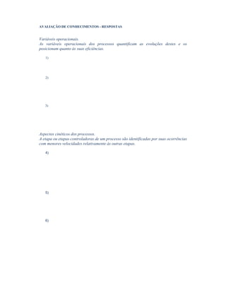 Este documento discute cinética e cálculo de reatores heterogêneos. Ele aborda variáveis operacionais como frações de conversão, rendimentos e seletividades. Também discute aspectos cinéticos como identificar etapas controladoras e propor taxas de reação globais para processos químicos homogêneos e heterogêneos. O documento contém perguntas sem respostas sobre esses tópicos.