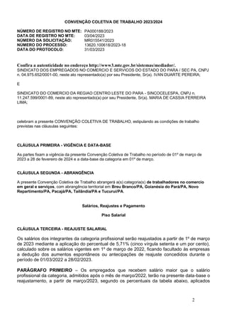 Este documento estabelece as condições de trabalho para empregados do comércio e serviços em várias cidades do Pará para 2023-2024. Ele define um reajuste salarial de 5,71%, estabelece o salário profissional em R$1.425,00 e trata de gratificações, horas extras, feriados e outros benefícios.