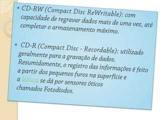 Um DVD-RW é um disco regravável que pode armazenar até 4,7 GB de dados e pode ser gravado e apagado cerca de 1.000 vezes antes de precisar ser substituído. DVD-RWs são comumente usados para backups e coleções de arquivos e também para gravação de vídeo. Um CD-RW pode ser gravado e apagado aproximadamente 1.000 vezes e usa uma liga que muda de estado quando aquecida por um laser para gravar ou apagar dados.