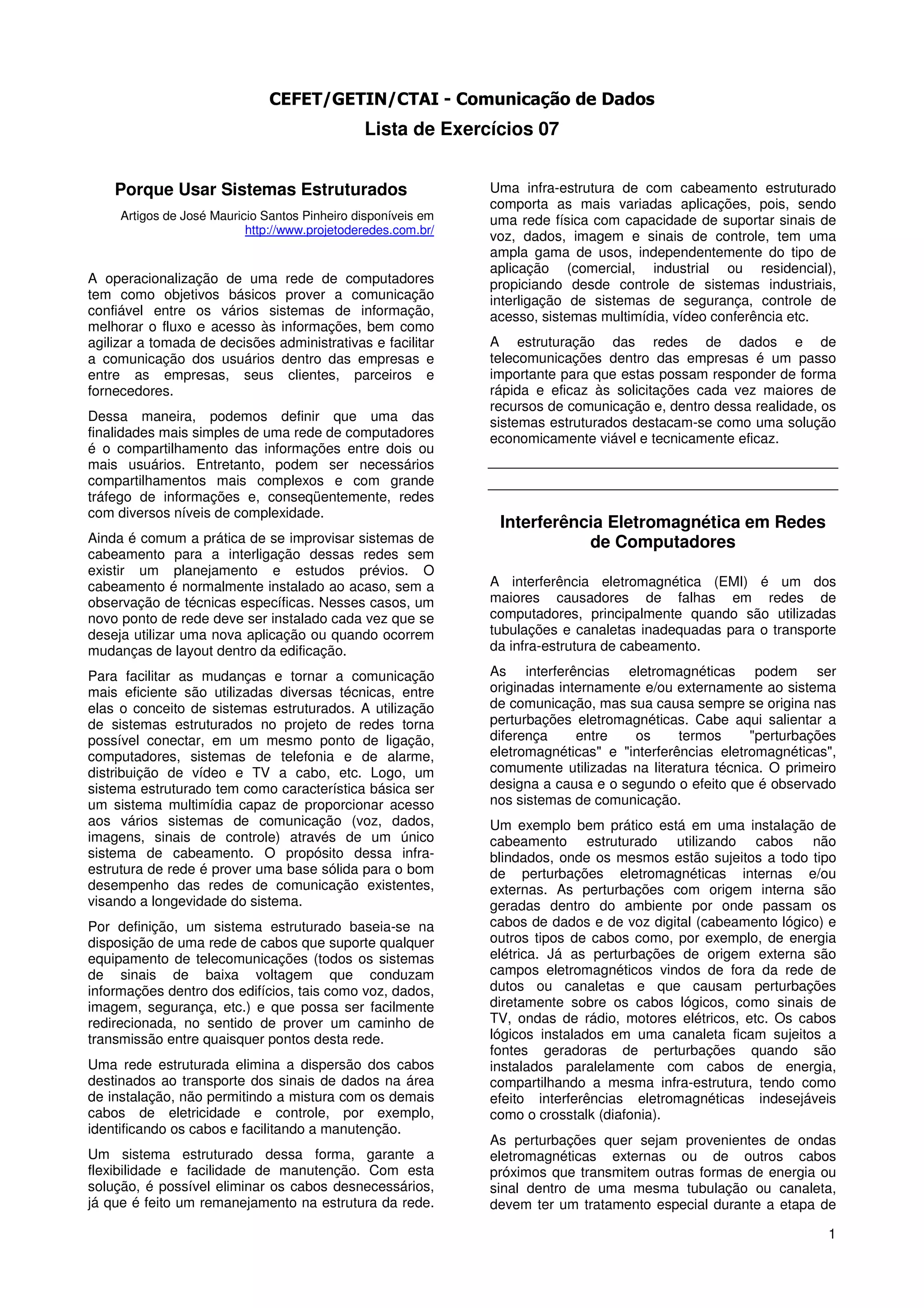 1) O documento discute os benefícios dos sistemas estruturados de cabeamento e as técnicas para evitar interferência eletromagnética em redes de computadores.