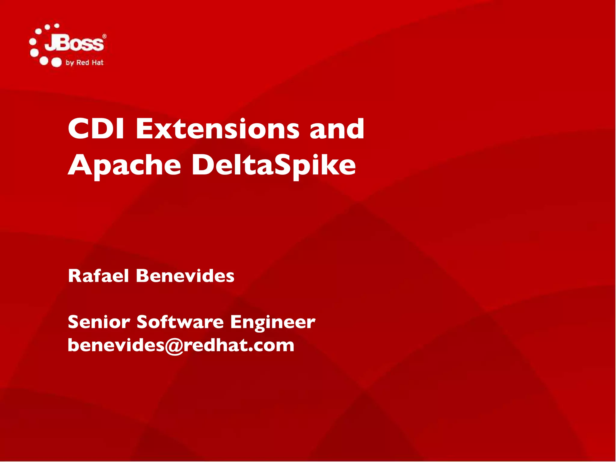 O documento discute o Apache DeltaSpike, um conjunto de extensões portáteis para o CDI que fornece funcionalidades úteis para aplicações Java. O DeltaSpike inclui módulos como segurança, JPA, JSF e agendamento de tarefas. Ele permite injeção de dependência tipada, configuração de projeto, recursos injetáveis e internacionalização de mensagens. O DeltaSpike facilita o desenvolvimento Java usando o CDI sem ser um framework completo.