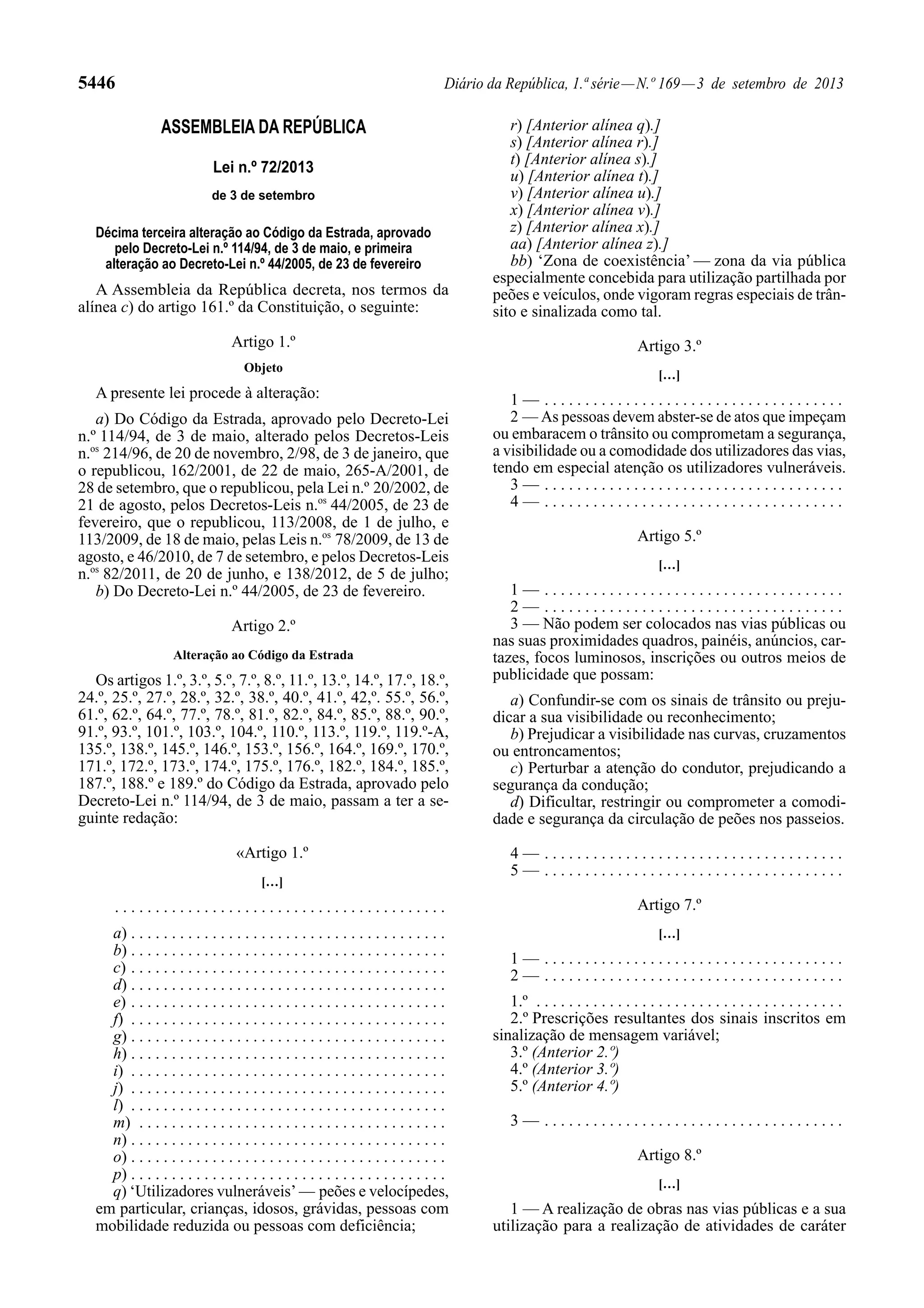 Este documento descreve alterações à lei do Código da Estrada de Portugal e ao Decreto-Lei n.o 44/2005. Vários artigos do Código da Estrada são alterados para refletir novas definições, regras de trânsito e sanções relativas a velocípedes, pedestres e zonas de coexistência. A lei também atualiza referências a decretos anteriores para manter a legislação consistente.