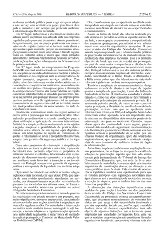 Este documento descreve as mudanças introduzidas por um decreto-lei para simplificar processos e reduzir custos relacionados a empresas em Portugal, incluindo: 1) tornar escrituras públicas facultativas para atos empresariais; 2) eliminar a obrigatoriedade de livros contábeis; 3) criar processos administrativos para dissolução de empresas inativas.