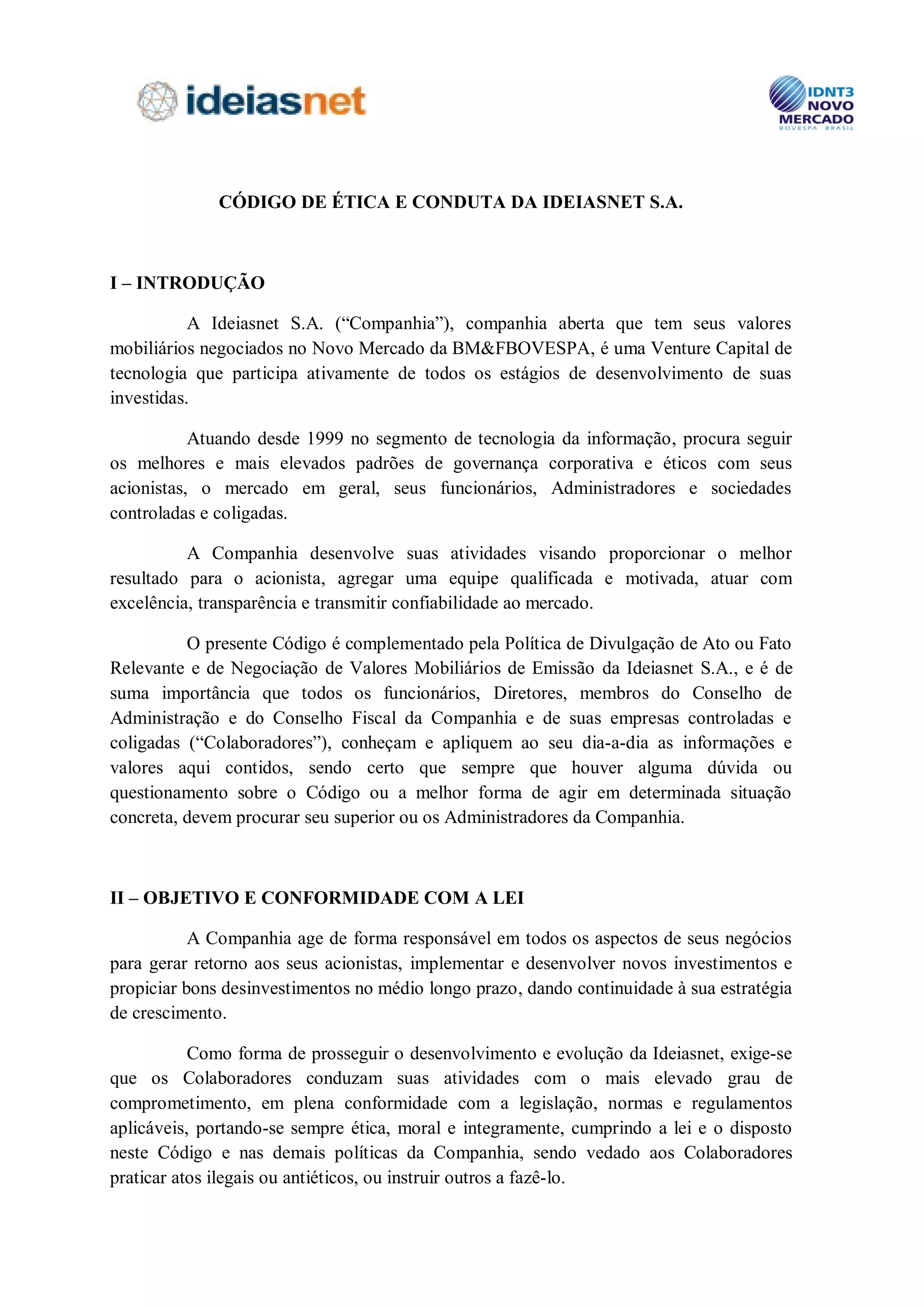 Este documento apresenta o Código de Ética e Conduta da Ideiasnet S.A., uma empresa de tecnologia. O código estabelece diretrizes para promover conduta ética, respeito, integridade e transparência entre funcionários, acionistas e público em geral.