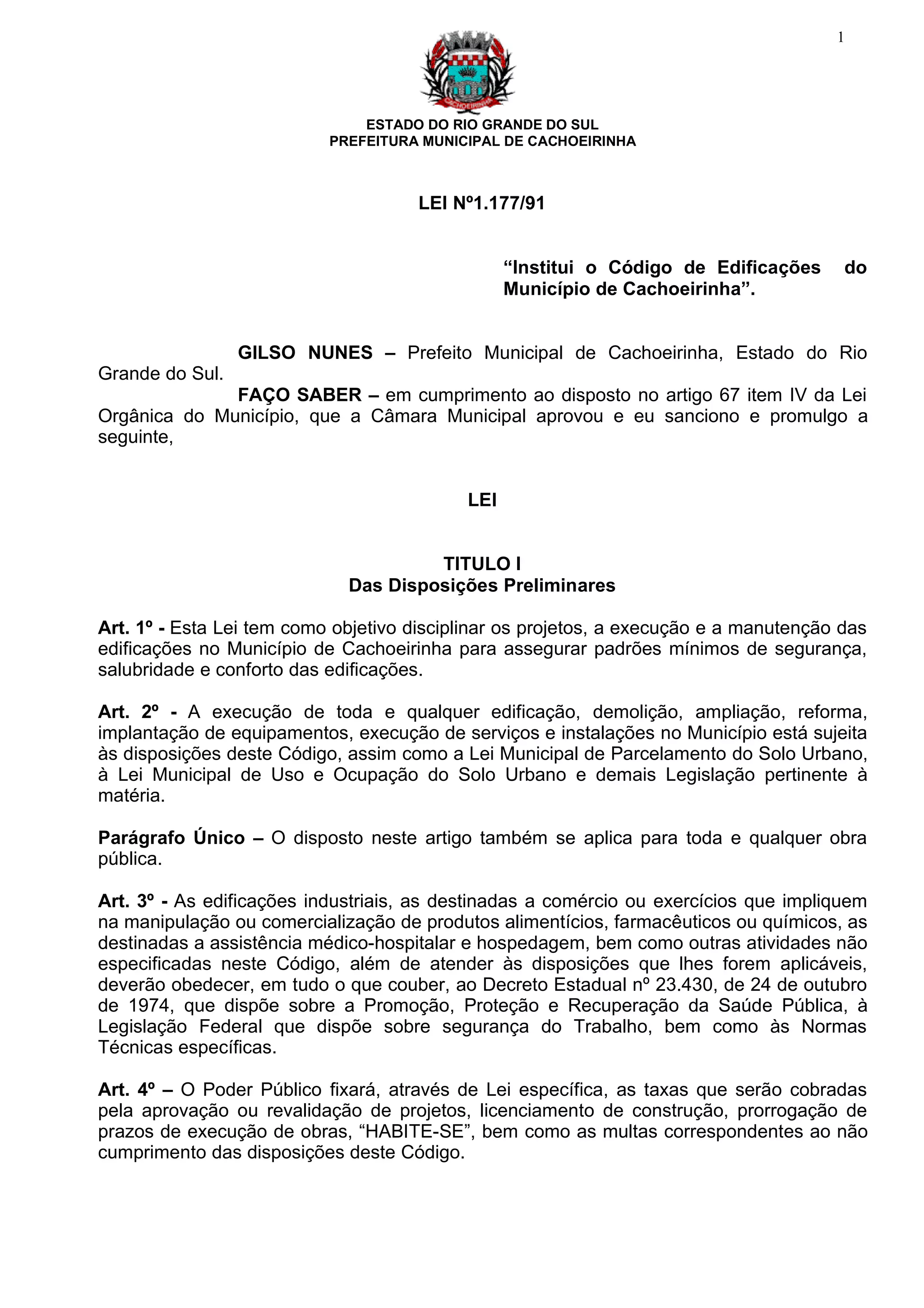 Este documento estabelece o Código de Edificações do município de Cachoeirinha no Rio Grande do Sul. Ele define regras para projetos, execução e manutenção de edificações para garantir padrões mínimos de segurança, saúde e conforto. Também determina responsabilidades técnicas, processos de aprovação de projetos e licenciamento de obras.
