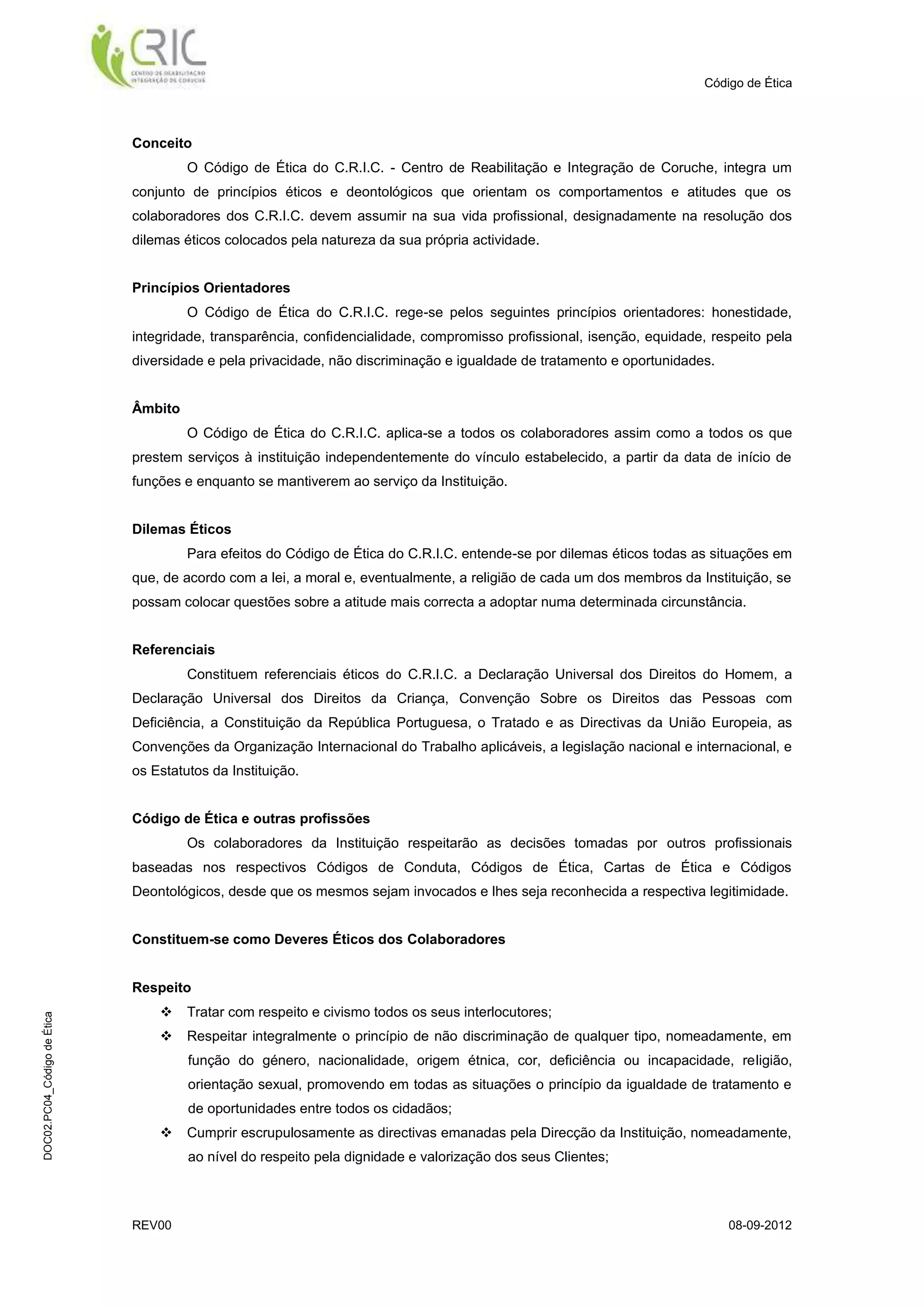 O documento apresenta o código de ética de uma instituição de reabilitação, definindo seus princípios como honestidade e respeito, além de estabelecer deveres éticos como confidencialidade e combate a discriminação. O código se aplica a todos os colaboradores e parceiros e prevê medidas caso haja violações de seus termos.