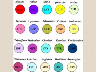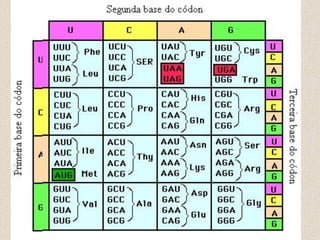 O documento resume os processos de replicação, transcrição e tradução do DNA para a produção de proteínas. Descreve que o DNA é duplicado na replicação, transcrito em RNA mensageiro na transcrição, que é depois traduzido em proteínas pela tradução do código genético em aminoácidos. Explica os tipos de RNA, como o RNAm transporta a informação do DNA para a síntese de proteínas nos ribossomos.