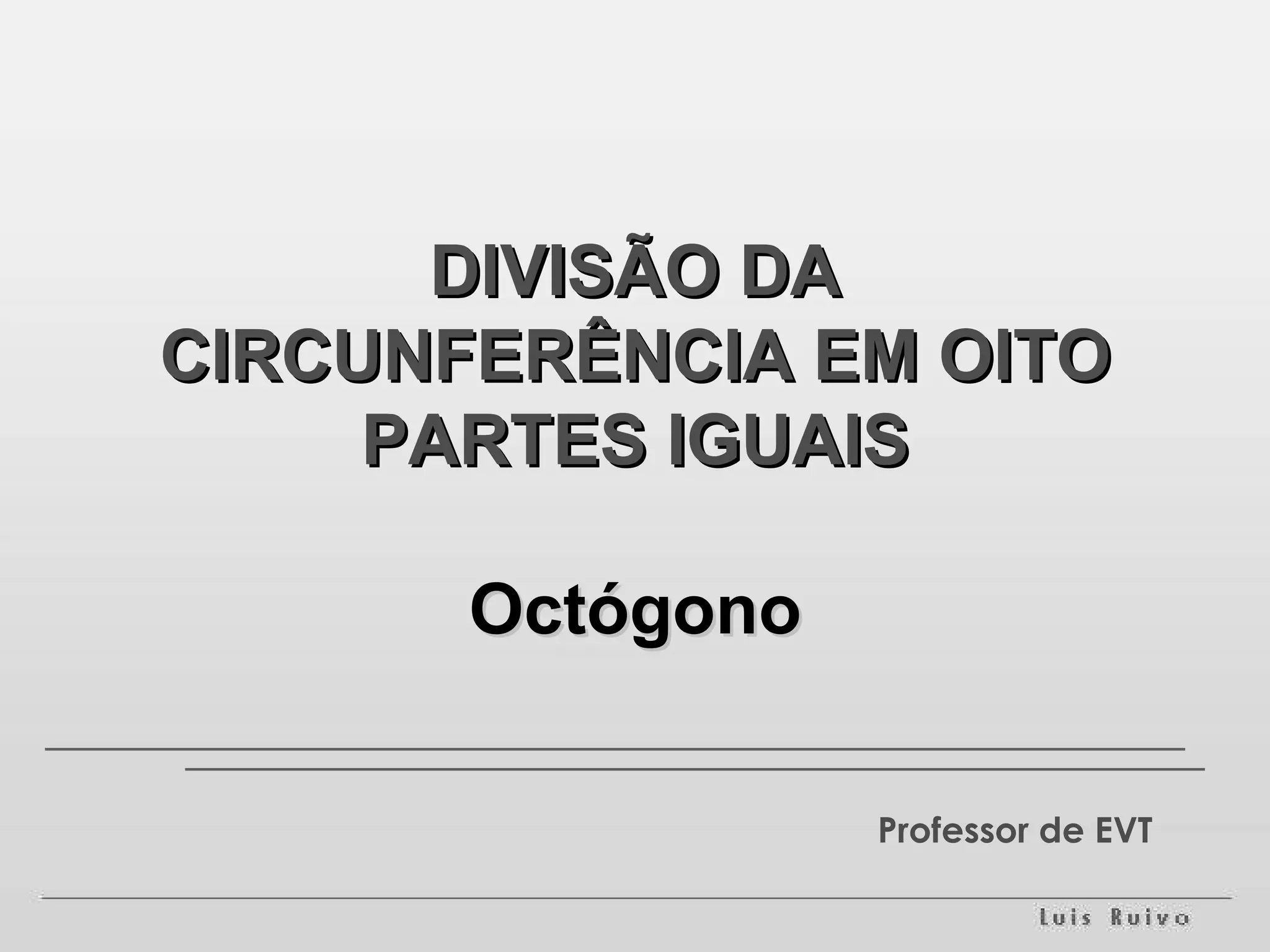 O documento fornece instruções para dividir uma circunferência em oito partes iguais através dos seguintes passos: 1) traçar um diâmetro, 2) traçar arcos intersectando-se a partir dos pontos finais do diâmetro, 3) definir uma linha perpendicular ao diâmetro pelos pontos de intersecção, e 4) continuar traçando arcos e linhas para delimitar oito regiões iguais dentro da circunferência.