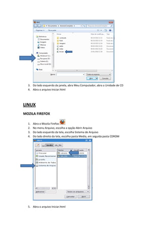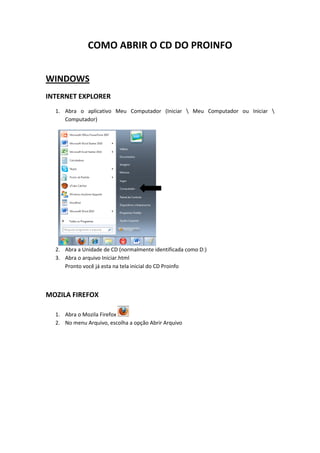 Este documento fornece instruções para abrir o CD Proinfo em três sistemas operacionais: Windows, Mozilla Firefox e Linux. Ele lista os passos para localizar e abrir o arquivo Iniciar.html que leva à tela inicial do CD em cada sistema, começando pelo Meu Computador no Windows e escolhendo o arquivo no Mozilla Firefox ou no gerenciador de arquivos no Linux.