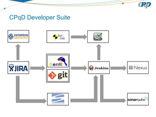 O documento apresenta a CPQD Developer Suite, que é um conjunto de ferramentas de software livre e de baixo custo para desenvolvimento eficiente. Ele discute a importância de práticas como controle de versão, revisão de código e integração contínua, destacando ferramentas específicas como Jira, Git, Jenkins e SonarQube. Além disso, menciona benefícios como aumento da qualidade do software e eficiência no gerenciamento de mudanças e projetos ágeis.