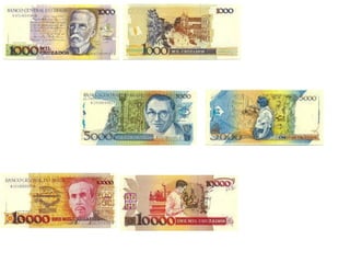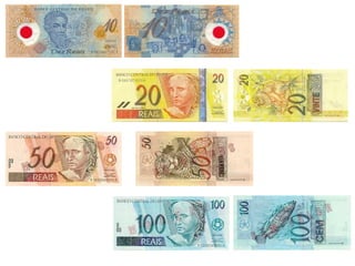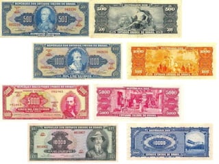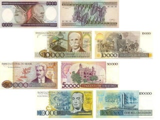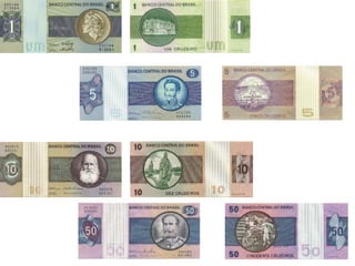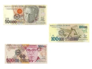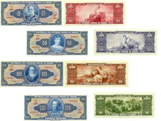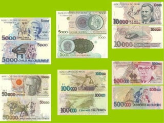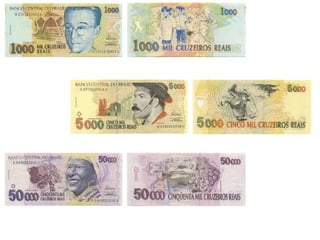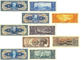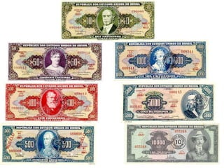 O documento descreve a evolução das moedas no Brasil desde 1833, mencionando as principais mudanças como a substituição do Mil-Réis pelo Cruzeiro em 1942, a introdução do Cruzeiro Novo em 1967 e do Real em 1994 como forma de combater a inflação endêmica no país. Resume também as taxas de conversão entre as diferentes moedas ao longo do tempo.