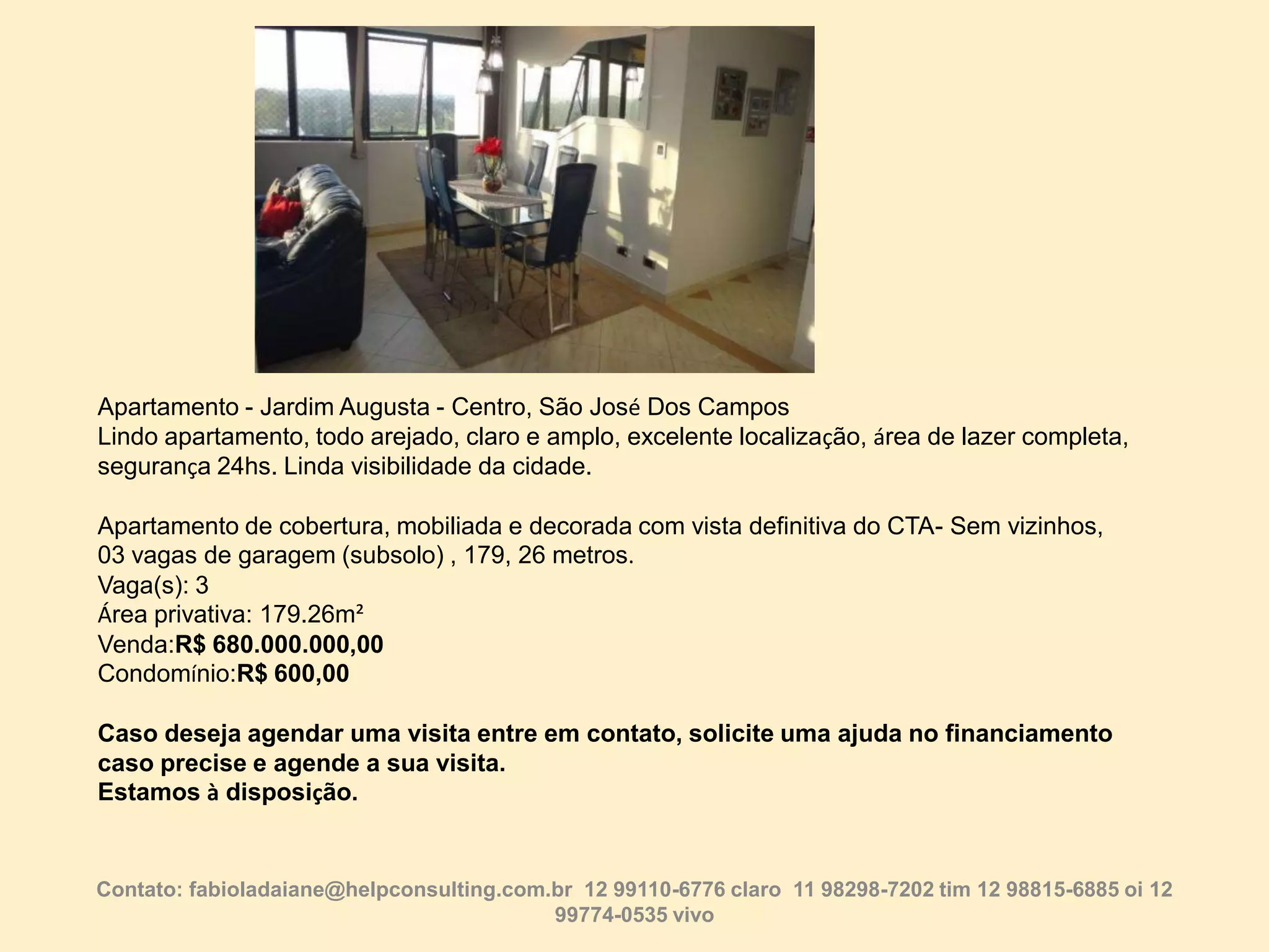 O anúncio descreve um apartamento de cobertura mobiliado com 179m2 em São José dos Campos por R$680.000,00, oferecendo 3 vagas de garagem, área de lazer e segurança 24h.