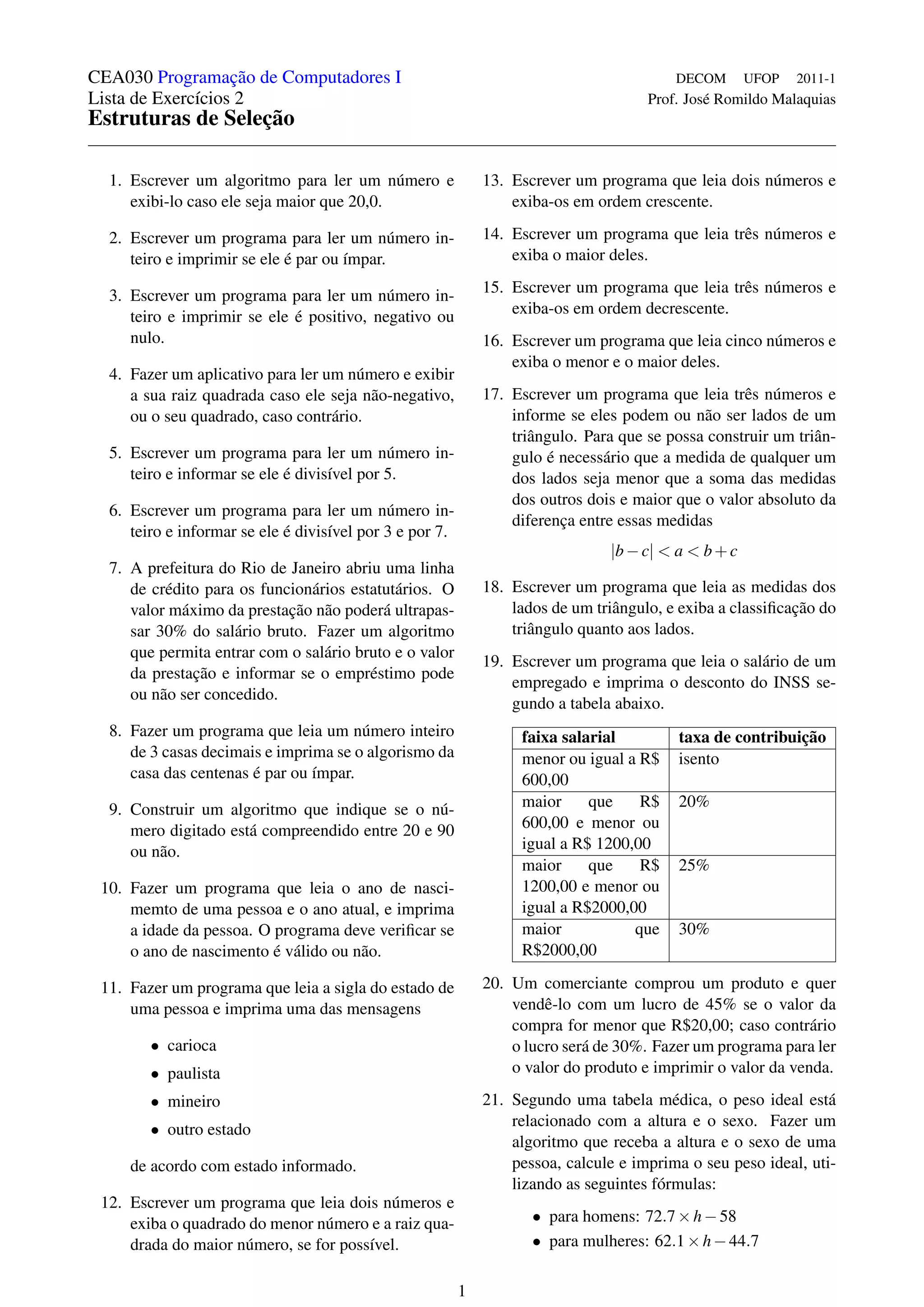 O documento apresenta 25 exercícios de programação com estruturas de seleção envolvendo leitura de dados e imprimir respostas baseadas em condições. Os exercícios abordam tópicos como números pares/ímpares, positivos/negativos, módulo, ordenação, triângulos, cálculo de peso ideal, entre outros.