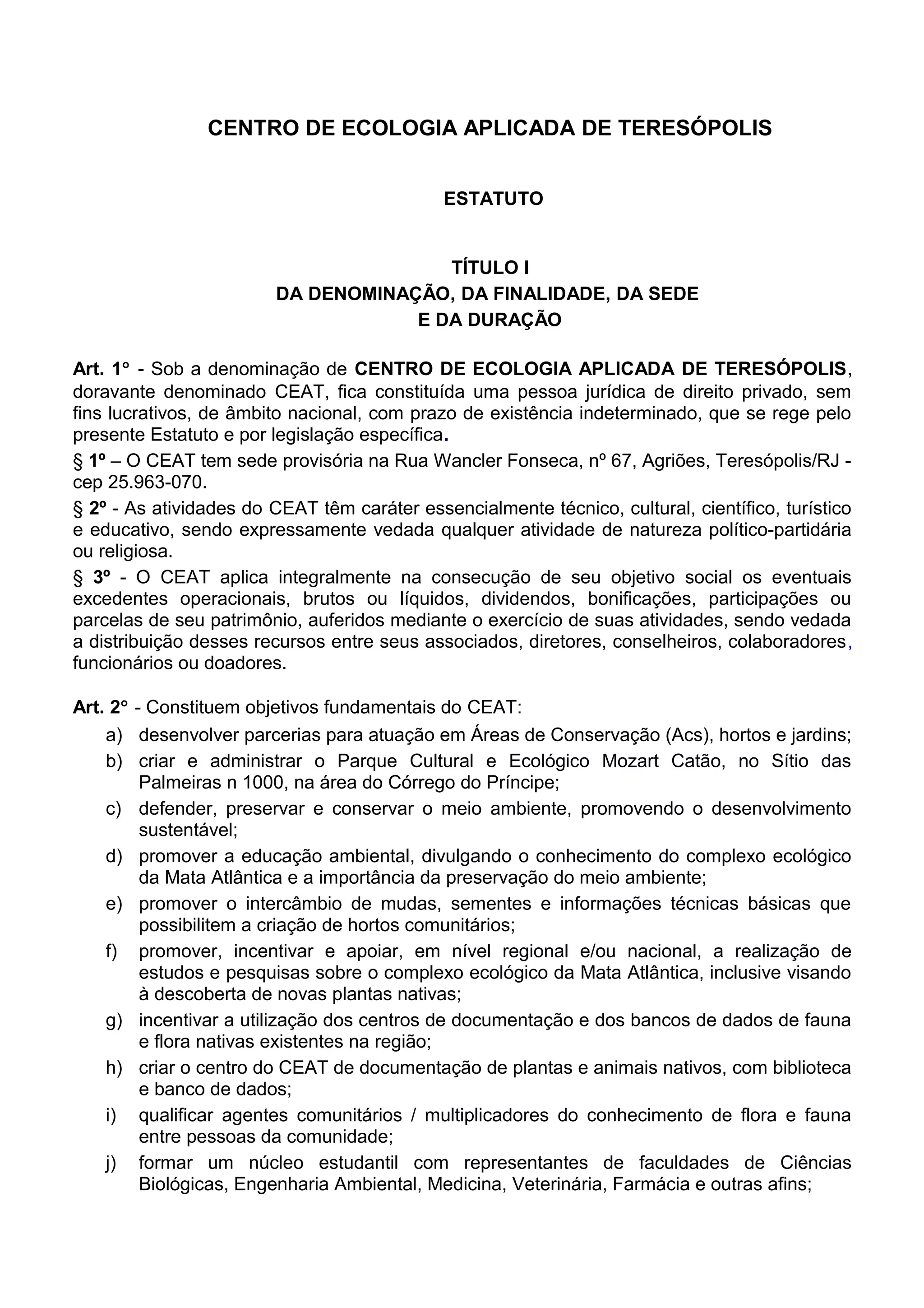 O documento descreve o estatuto do Centro de Ecologia Aplicada de Teresópolis (CEAT). O CEAT é uma associação sem fins lucrativos que tem como objetivos a preservação ambiental, educação ecológica e pesquisa sobre a Mata Atlântica. O estatuto define a administração da associação, formada por uma Assembleia Geral, Diretoria e Conselho Fiscal.