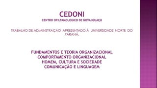 O documento analisa o ambiente organizacional da clínica Cedoni, destacando aspectos de sua estrutura e gestão. Ele aborda a importância do planejamento, controle e comunicação na motivação e satisfação dos funcionários, além de como a organização lida com estresse e promove um clima de trabalho positivo. A clínica adota práticas de valorização dos colaboradores, utilizando reuniões mensais para identificar e melhorar deficiências organizacionais.