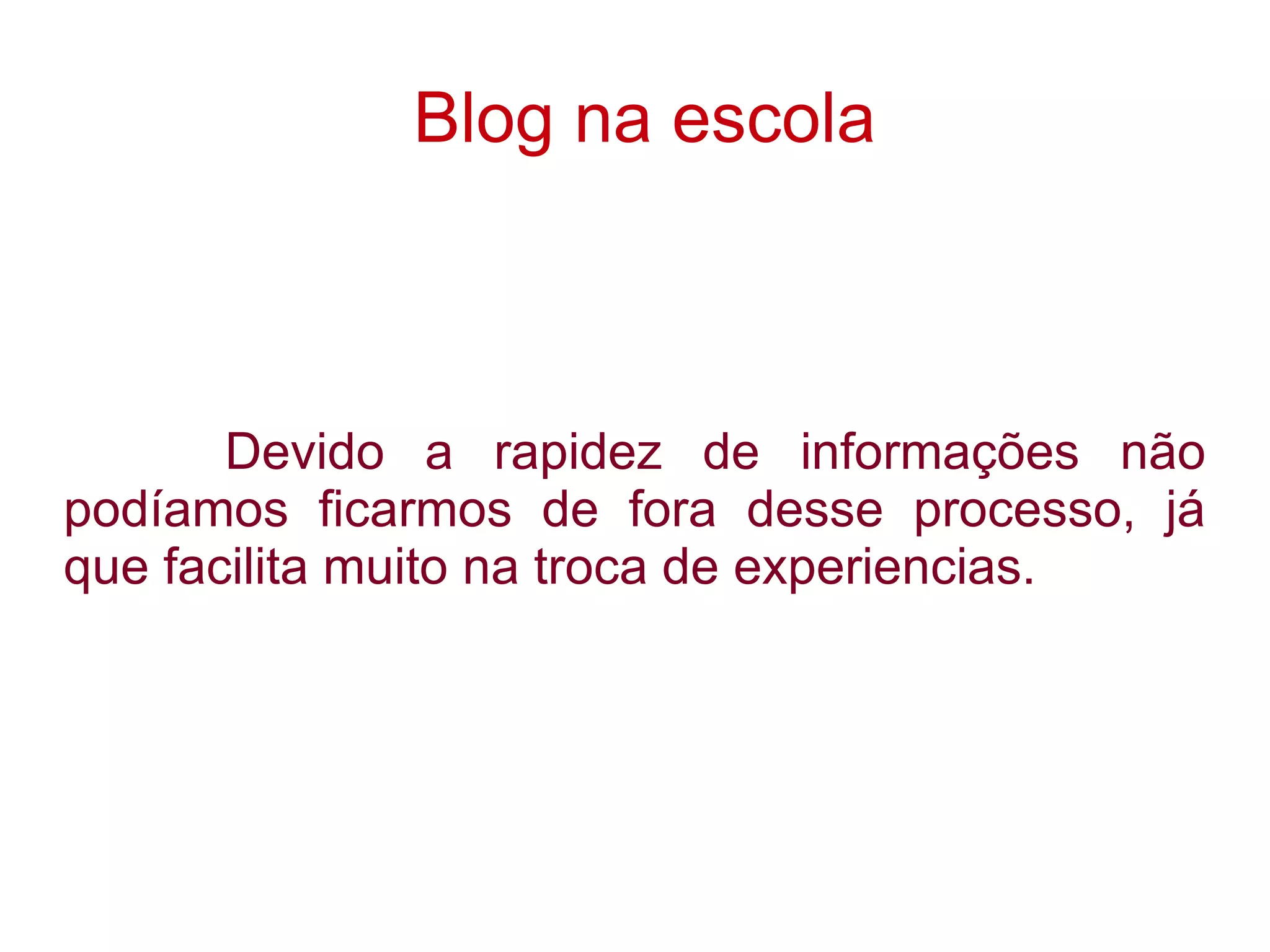 Uma escola criou um blog para facilitar a troca de informações e experiências entre alunos e professores. O blog oferece muitos benefícios como a possibilidade de compartilhar projetos com outras escolas e usar o tempo de forma mais eficiente. É uma iniciativa positiva que aproveita as vantagens da era digital quando usada corretamente.