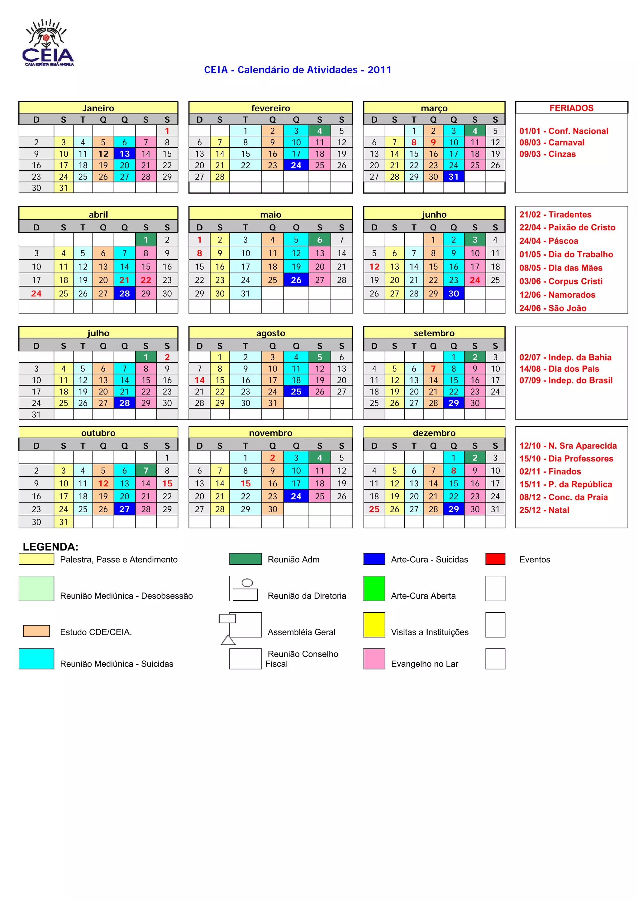 O documento apresenta o calendário de atividades da CEIA para 2011, com as datas dos feriados e eventos programados para cada mês, incluindo palestras, reuniões, atendimentos mediúnicos e eventos especiais.
