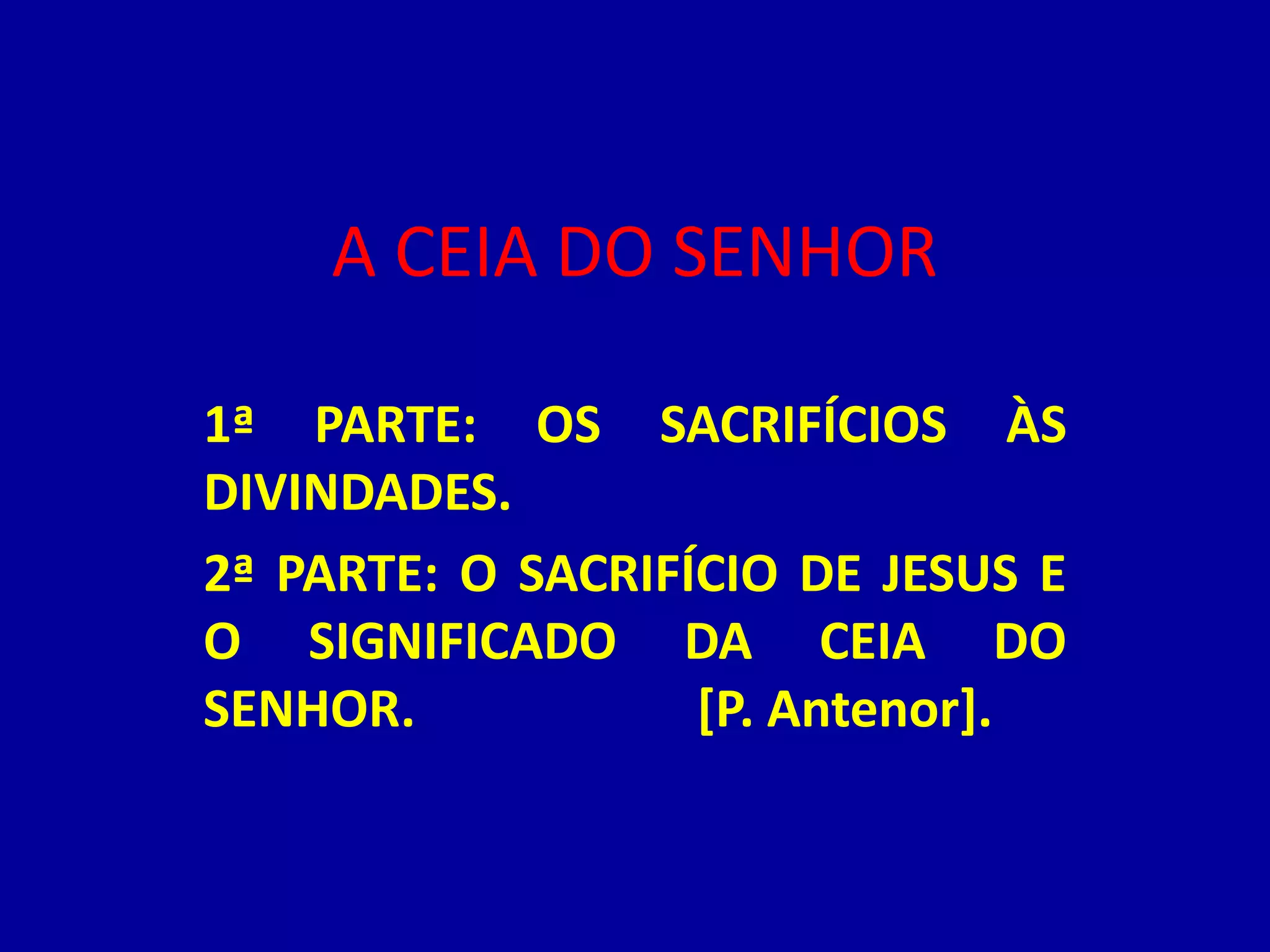 O documento descreve os sacrifícios religiosos na antiguidade, comparando os sacrifícios judaicos e gregos. Também discute o sacrifício de Jesus na Ceia do Senhor, que substitui os sacrifícios animais e estabelece a nova aliança entre Deus e a humanidade.