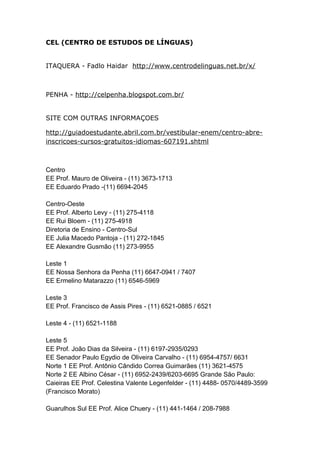 O documento fornece informações sobre o CEL (Centro de Estudos de Línguas), incluindo endereços de unidades em Itaquera e Penha, além de um link para mais informações. Ele lista as coordenadas de diversas unidades do CEL, divididas por regiões da cidade de São Paulo.