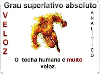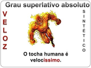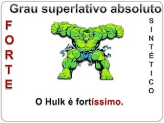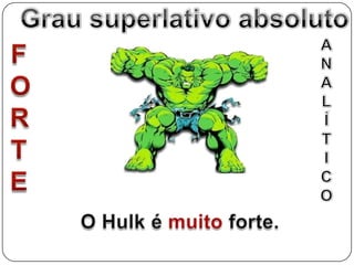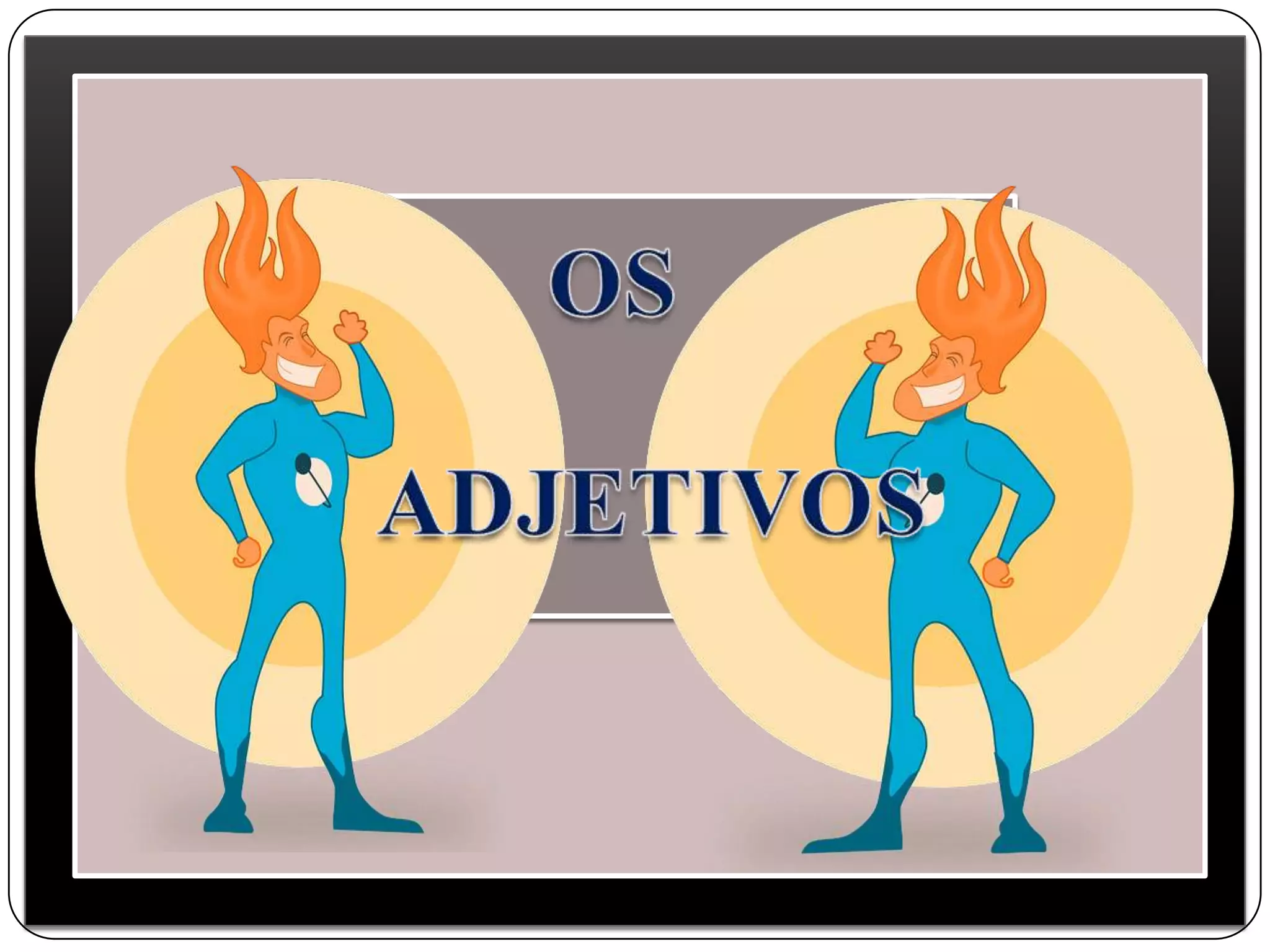 Este documento discute os diferentes tipos de adjetivos em português e como eles variam de acordo com gênero, número e grau. Existem dois tipos principais de adjetivos: qualificativos, que atribuem qualidades aos nomes, e numerais, que indicam ordem ou sequência. A maioria dos adjetivos varia a forma de acordo com gênero e número, mas alguns têm apenas uma forma. O grau é a categoria que mais causa variação na forma dos adjetivos, que podem estar no positivo, comparativo ou superlativo