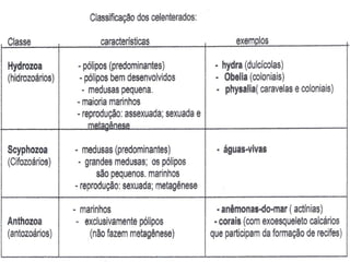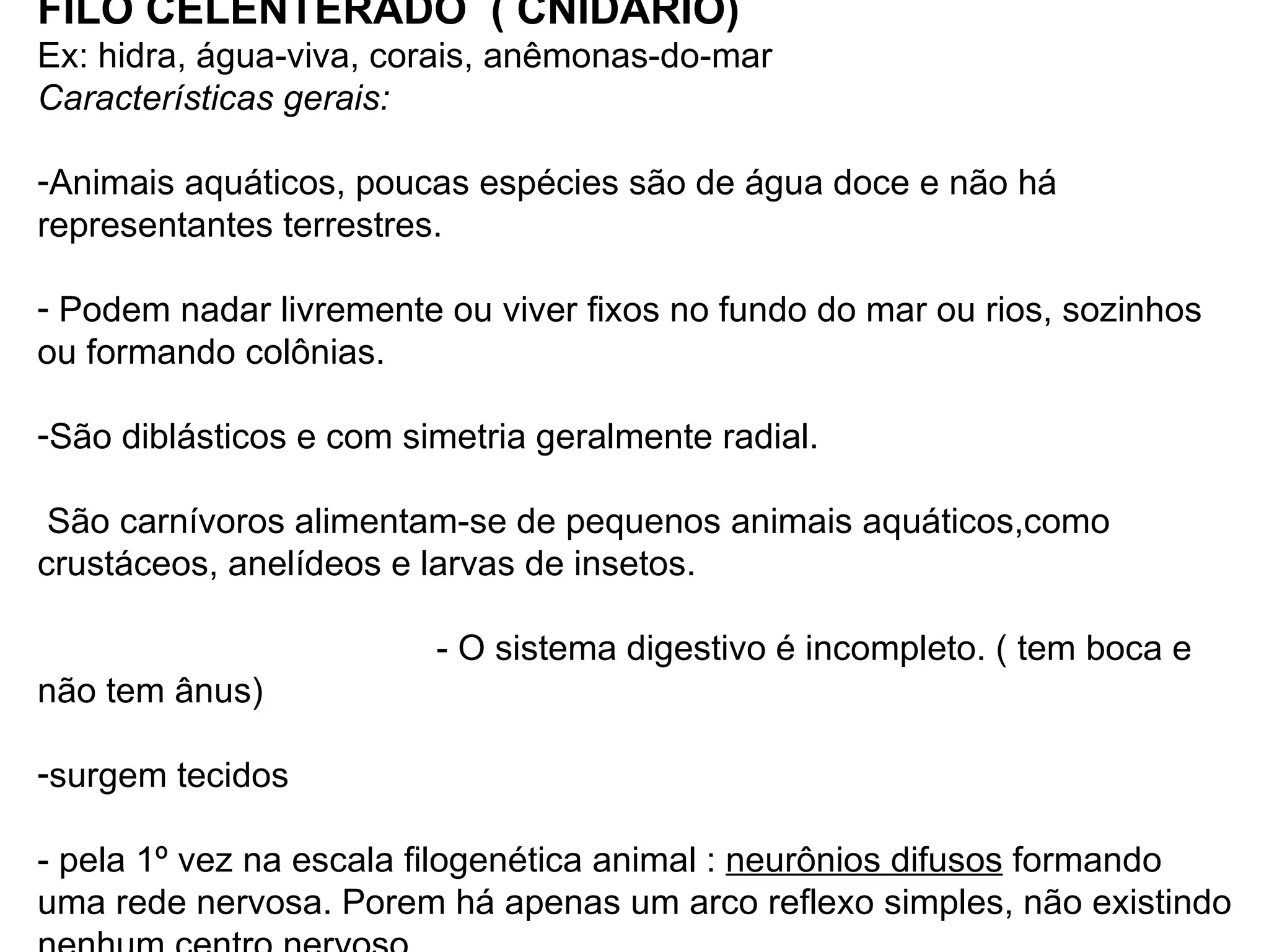 1) Os cnidários são animais aquáticos predadores como hidras, águas-vivas e corais que apresentam simetria radial e sistema digestivo incompleto.