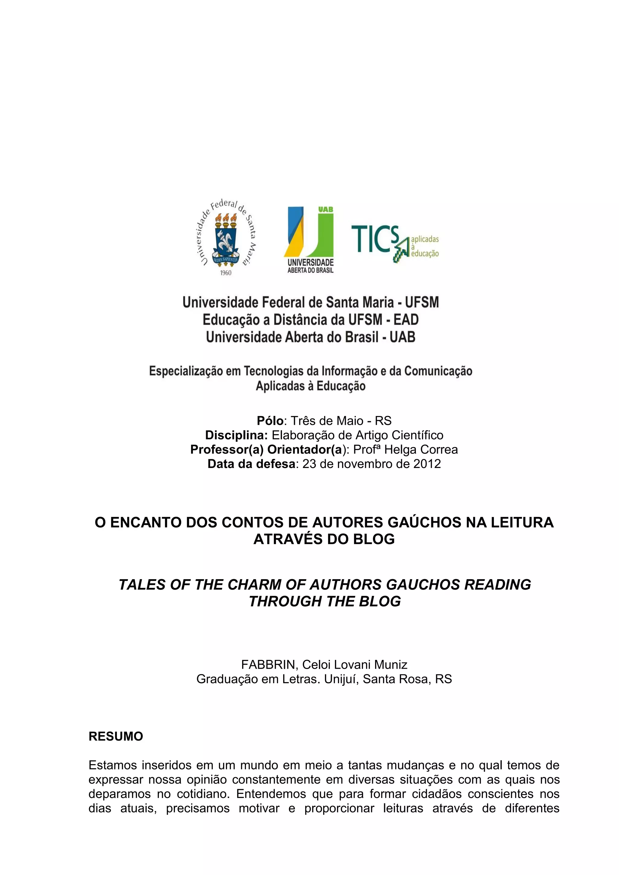 O documento descreve uma pesquisa sobre o uso de um blog para estimular a leitura de contos de autores gaúchos entre estudantes do ensino médio. O objetivo era motivar os alunos a ler e comentar os contos, aproveitando as vantagens das novas tecnologias. A pesquisa analisou os benefícios da leitura para a formação dos estudantes e como o blog pode ajudar a despertar o interesse pela leitura de literatura.