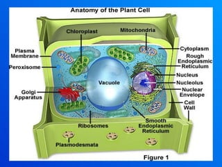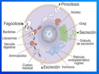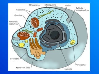 O documento descreve as principais características e componentes de células procariotas e eucariotas. Ele detalha a membrana plasmática, suas funções de proteção, forma e transporte seletivo. Também explica os tipos de transporte através da membrana, como osmose, difusão e transporte ativo/passivo. Por fim, lista os principais organelas citoplasmáticas membranosas e não membranosas encontradas em células eucariotas.